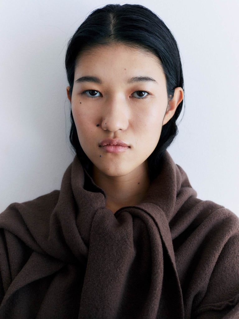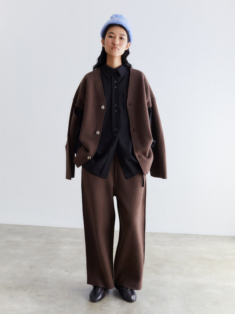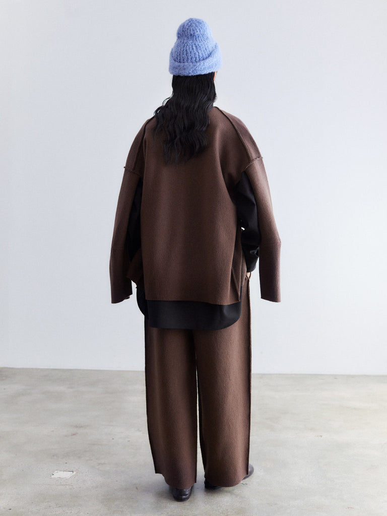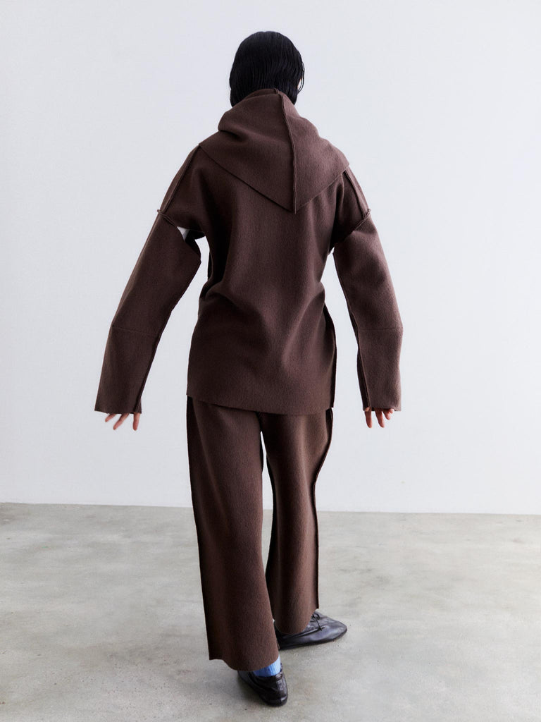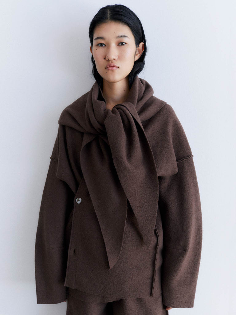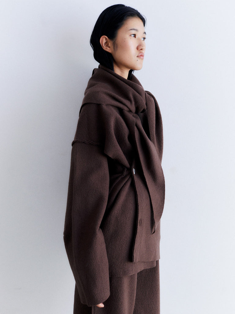 Buttoned cardigan featuring a detachable layered triangle scarf, crafted from boiled merino wool. Designed with a relaxed silhouette and a below-hip length, it features dropped shoulders, exposed seams and curved sleeves. Side buttons and armhole cutouts add versatility for ease of movement and multiple styling options.