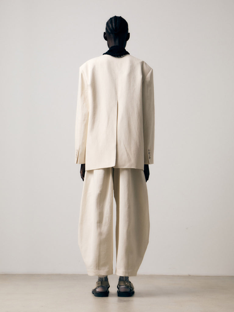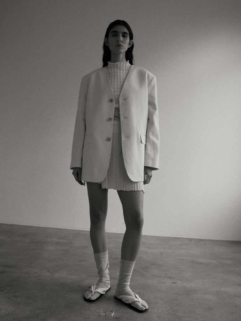 Collarless suit jacket Regular priceSingle-breasted collarless suit jacket crafted from a textured cotton-linen fabric. Cut to a relaxed fit with wide shoulders and a below hip length. Fully lined, featuring a central slit on the back and front flap pockets.