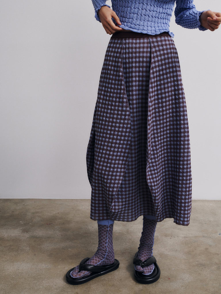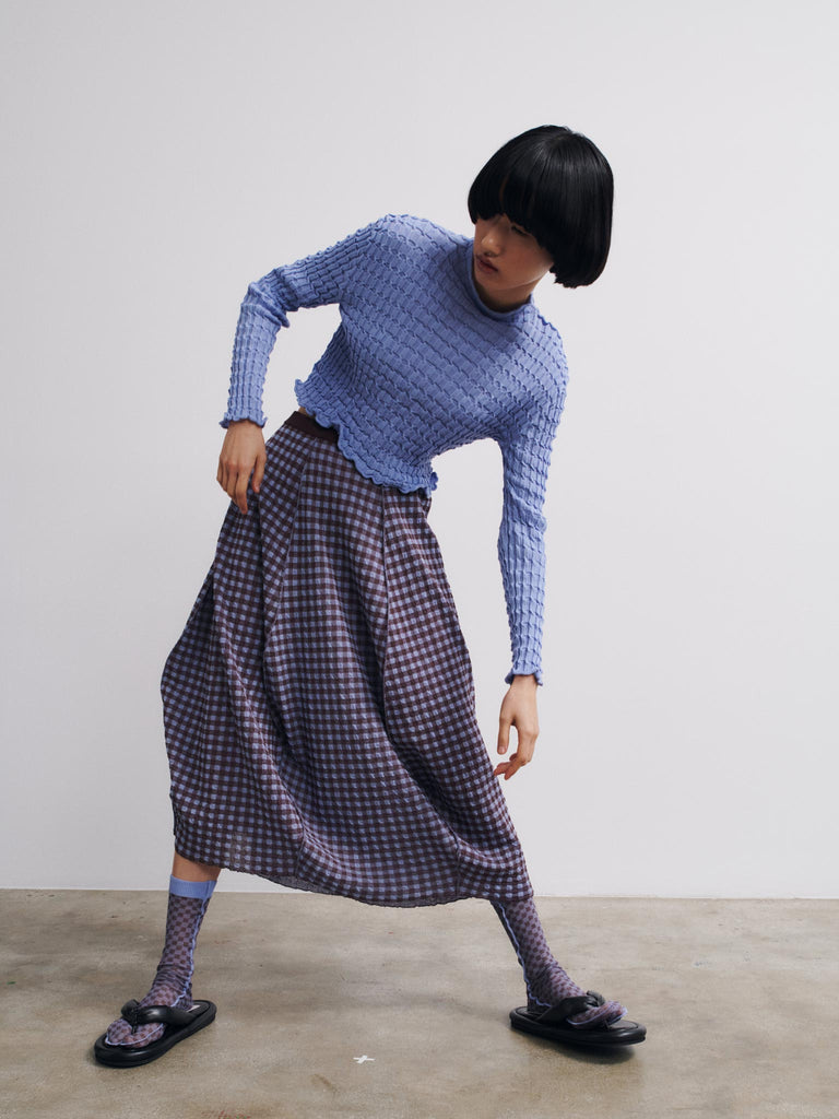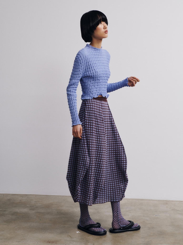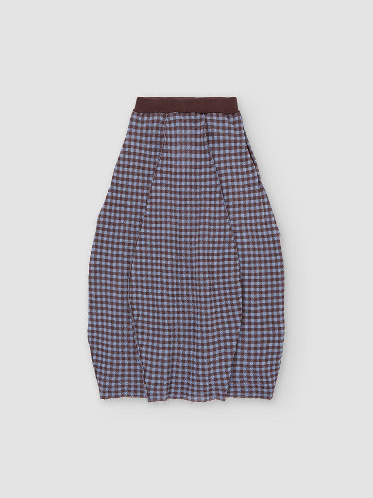 Balloon gingham skirt Regular priceBalloon midi skirt crafted in a lightweight gingham two-tone textured jacquard, knitted from ultrafine makò cotton. Rounded panelled structure featuring exposed seams, side pockets and a ribbed elasticated waistband.