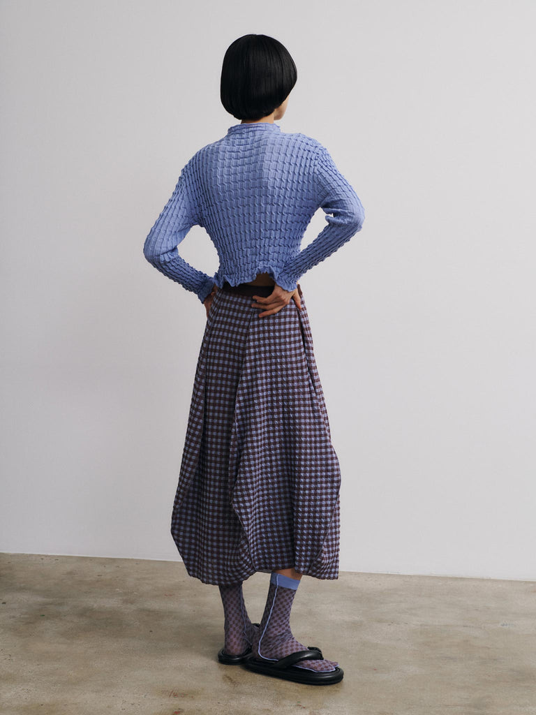 Balloon midi skirt crafted in a lightweight gingham two-tone textured jacquard, knitted from ultrafine makò cotton. Rounded panelled structure featuring exposed seams, side pockets and a ribbed elasticated waistband.