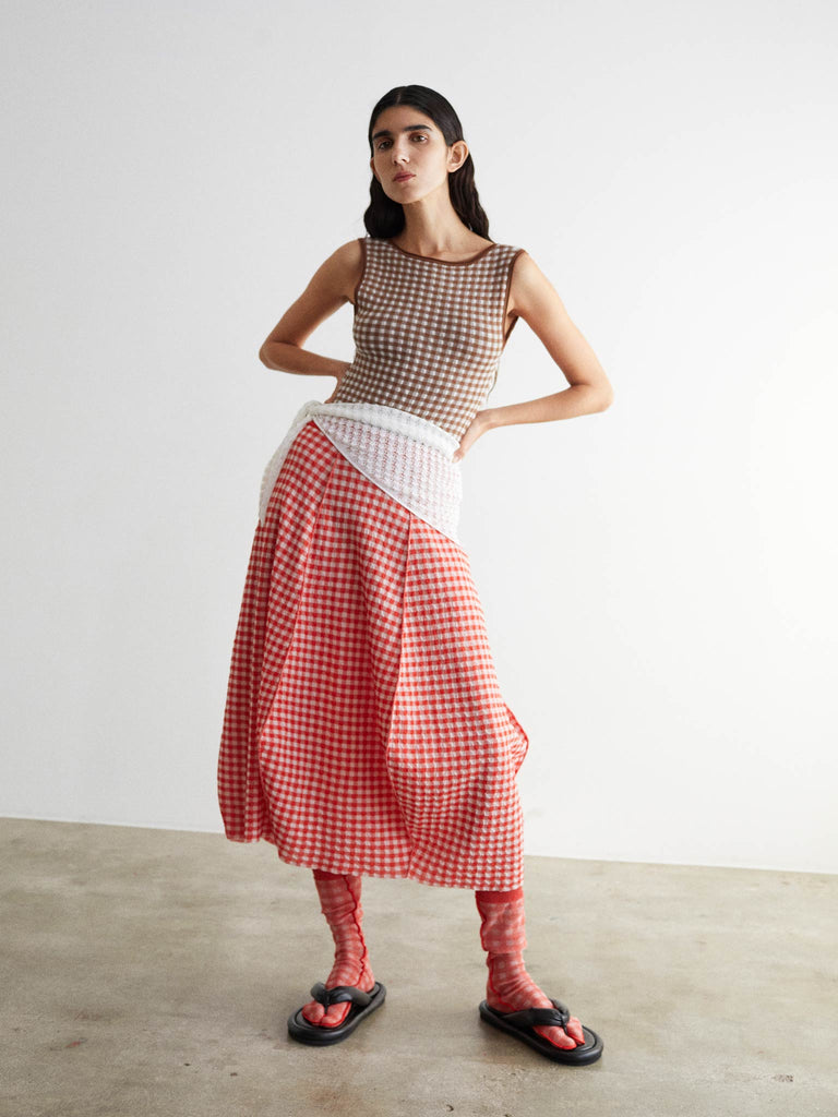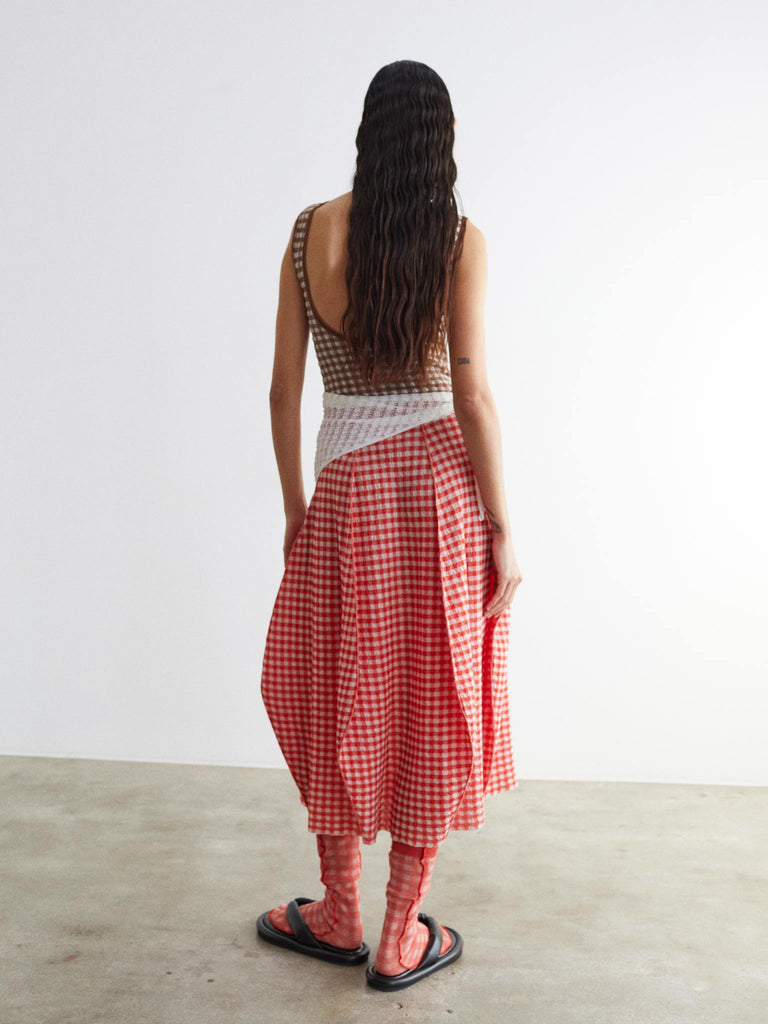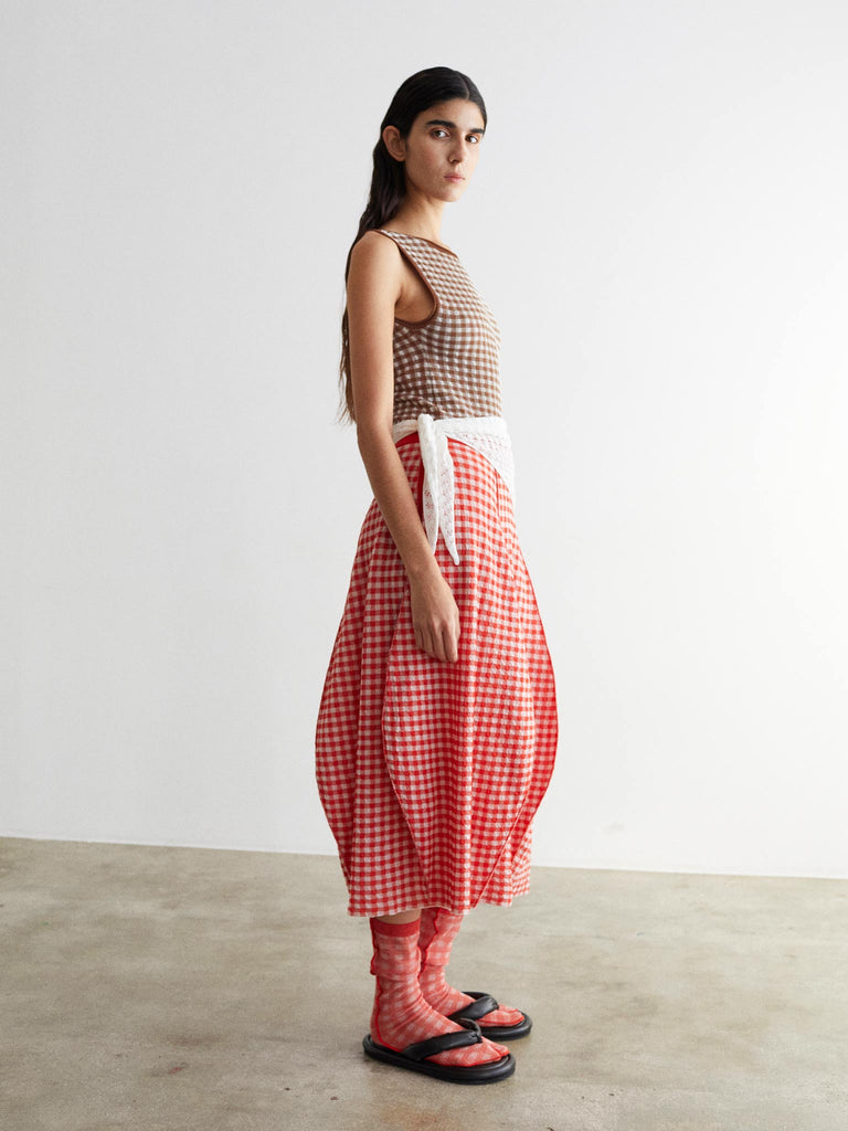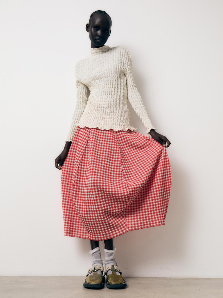 Balloon gingham skirt Regular priceBalloon midi skirt crafted in a lightweight gingham two-tone textured jacquard, knitted from ultrafine makò cotton. Rounded panelled structure featuring exposed seams, side pockets and a ribbed elasticated waistband.