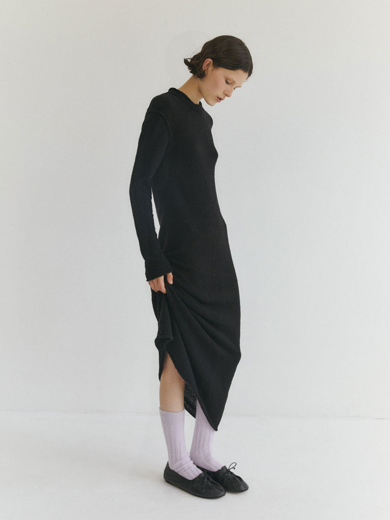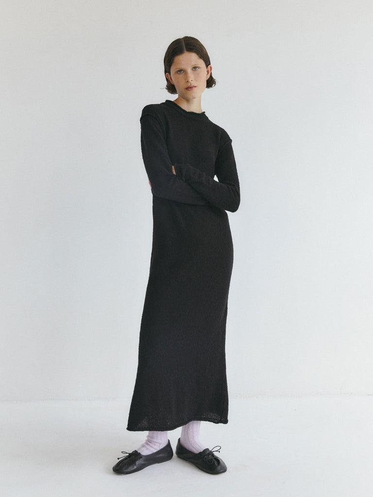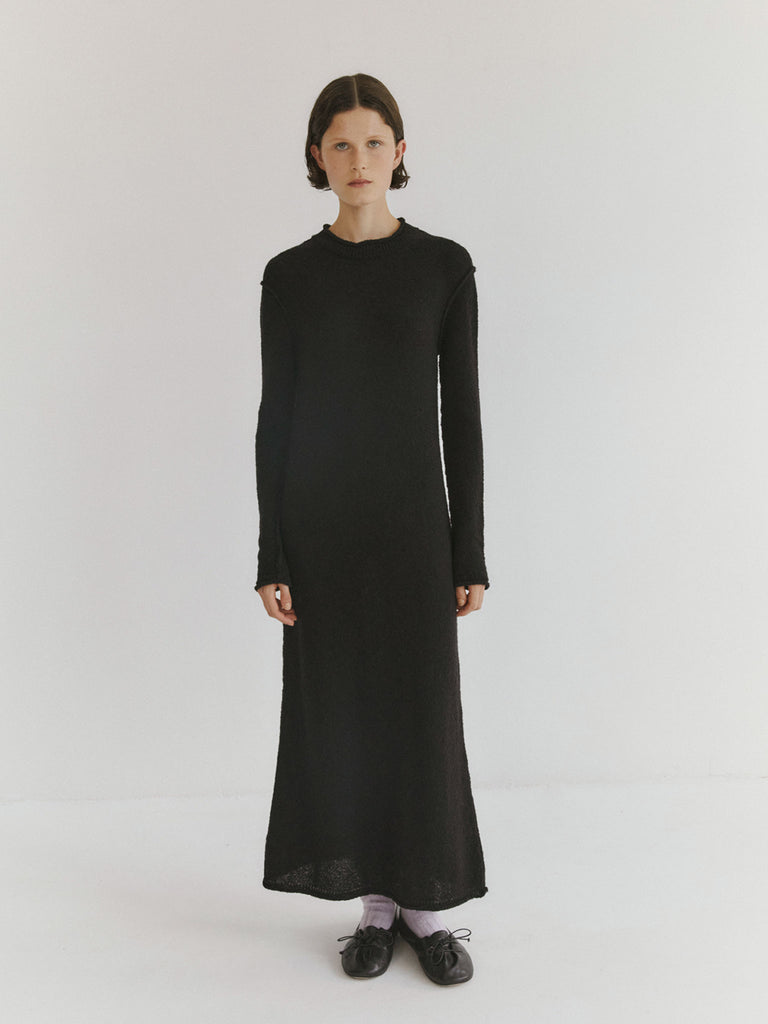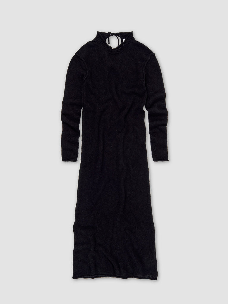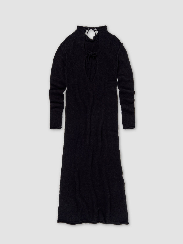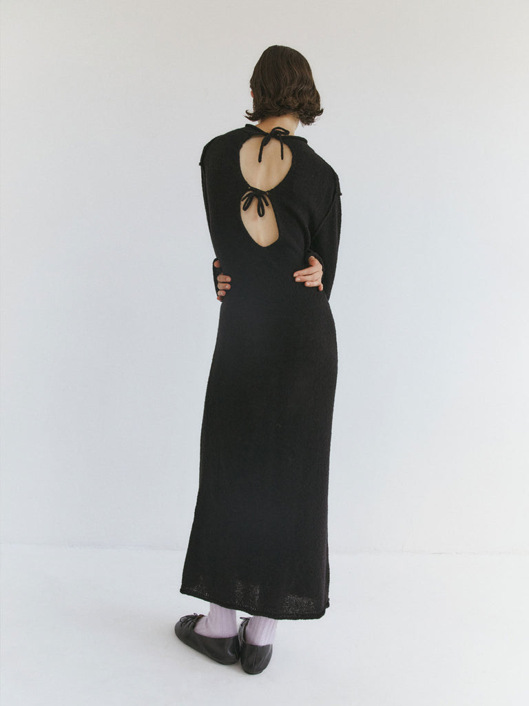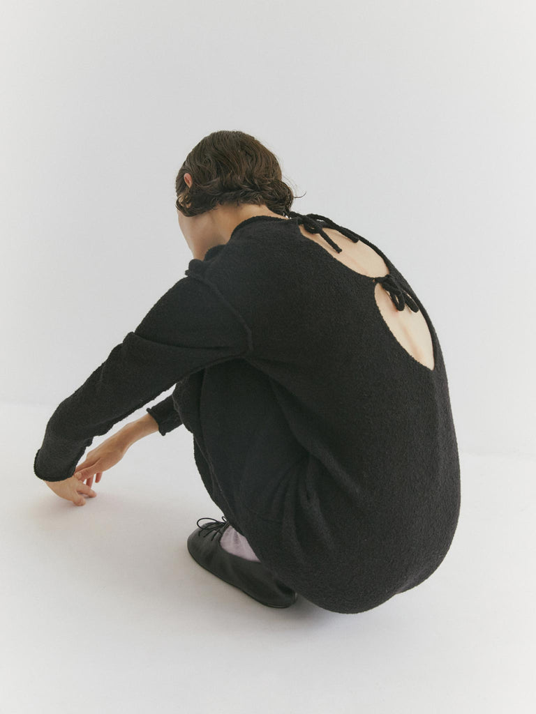 Elongated dress knitted from soft and lightweight wool bouclé. Straight silhouette featuring a cut-out tie up detailing on the back, exposed seams and rolled trims on the neck, cuffs and hem.