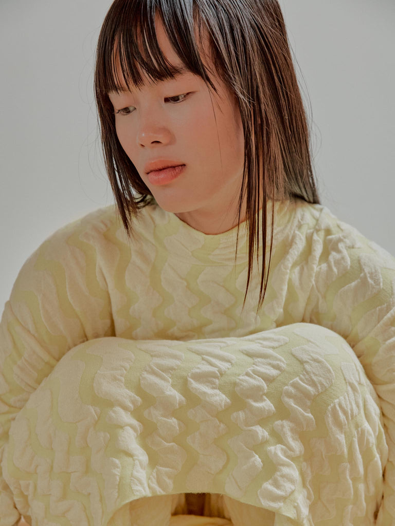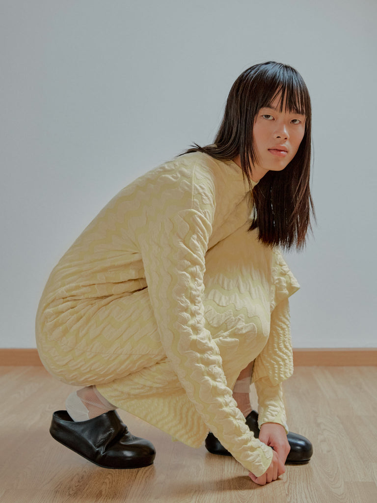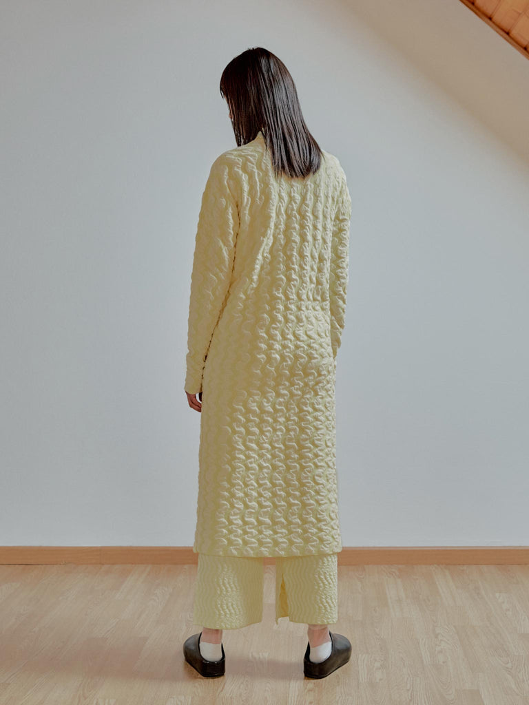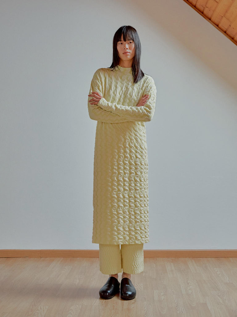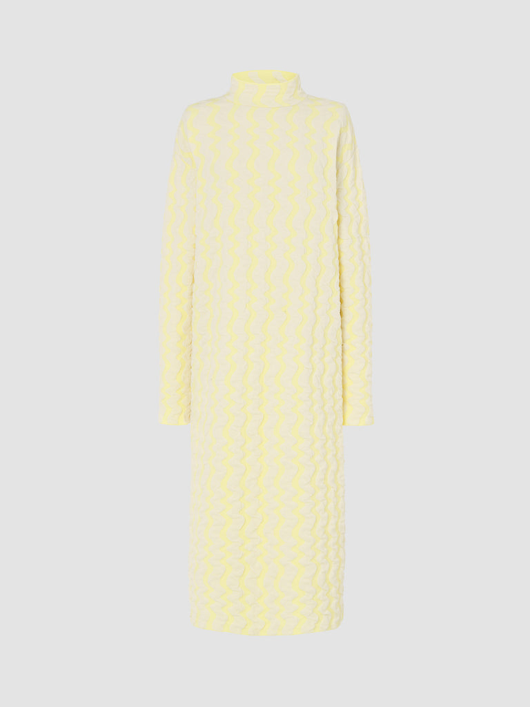 Jacquard textured dress Regular priceMidi long-sleeved dress crafted in a wavy textured two-tone jacquard, knitted from fine merino wool and organic cotton with a touch of stretch. Straight fit featuring a mock neck and slightly elongated sleeves.