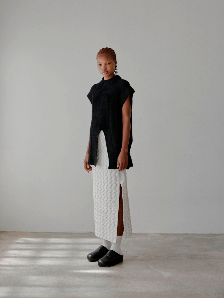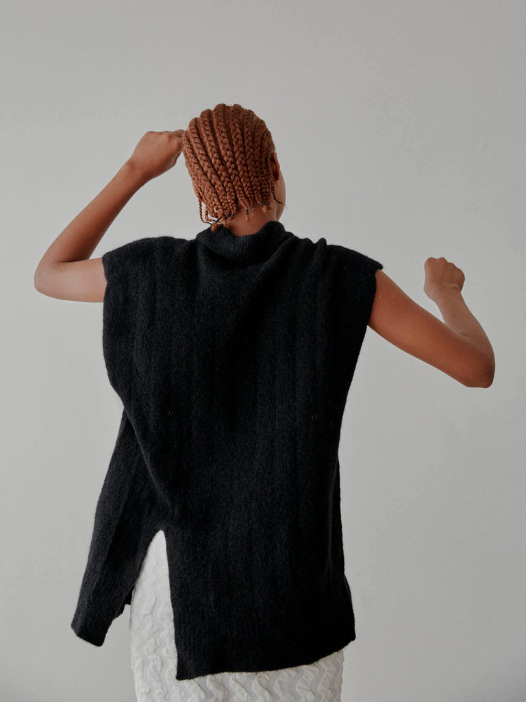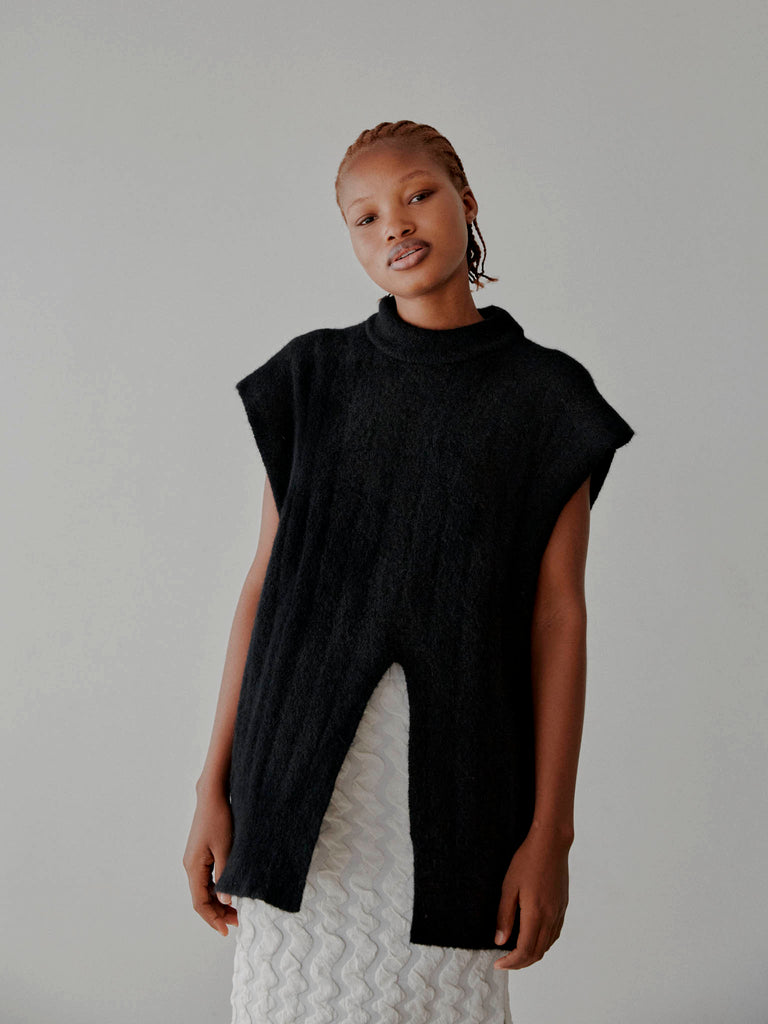 Crewneck alpaca vest Regular priceCrewneck vest featuring wide ribs all over, knitted from a fuzzy alpaca wool blend yarn. Relaxed fit featuring deep armholes and asymmetrical splits. Perfect to be layered over and under.