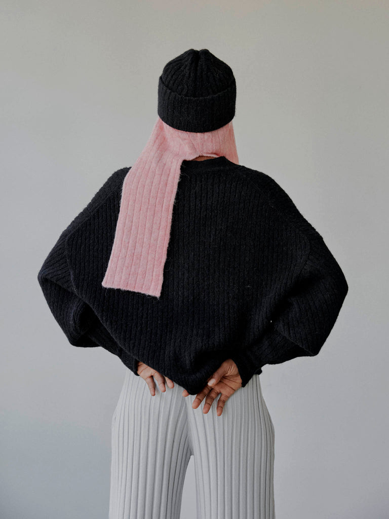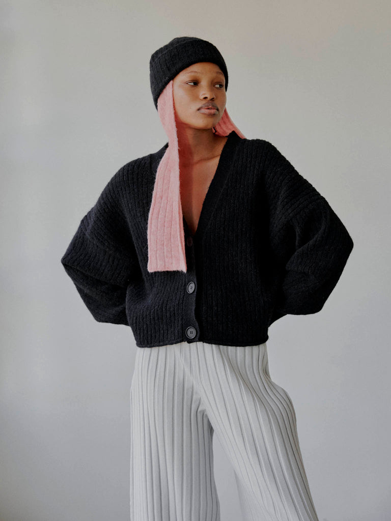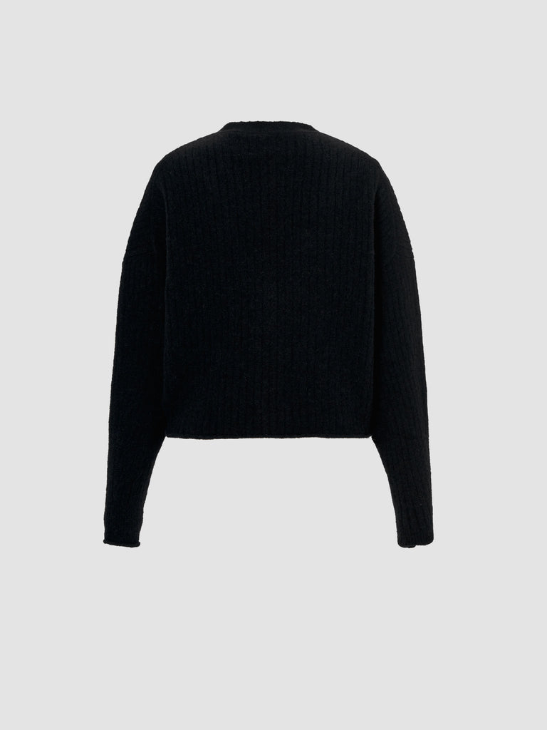 Ribbed crop cardigan knitted from a soft and fuzzy baby alpaca blend. Relaxed fit featuring ample sleeves and a button closure at the front. Perfect to be worn with high-waist pants or layered over dresses.
