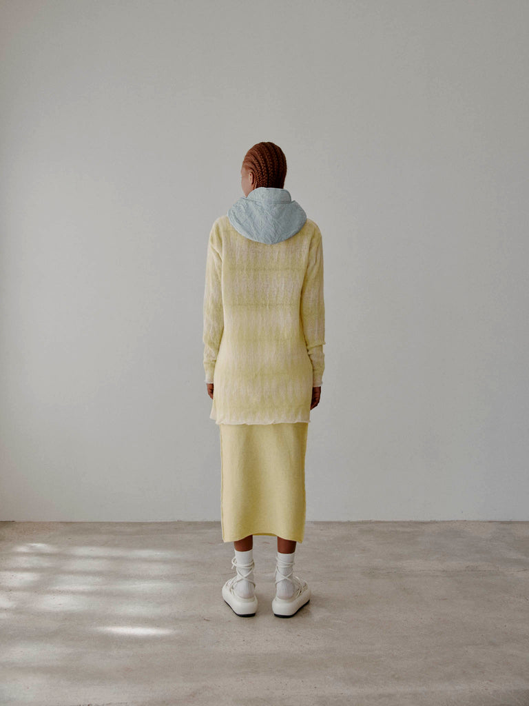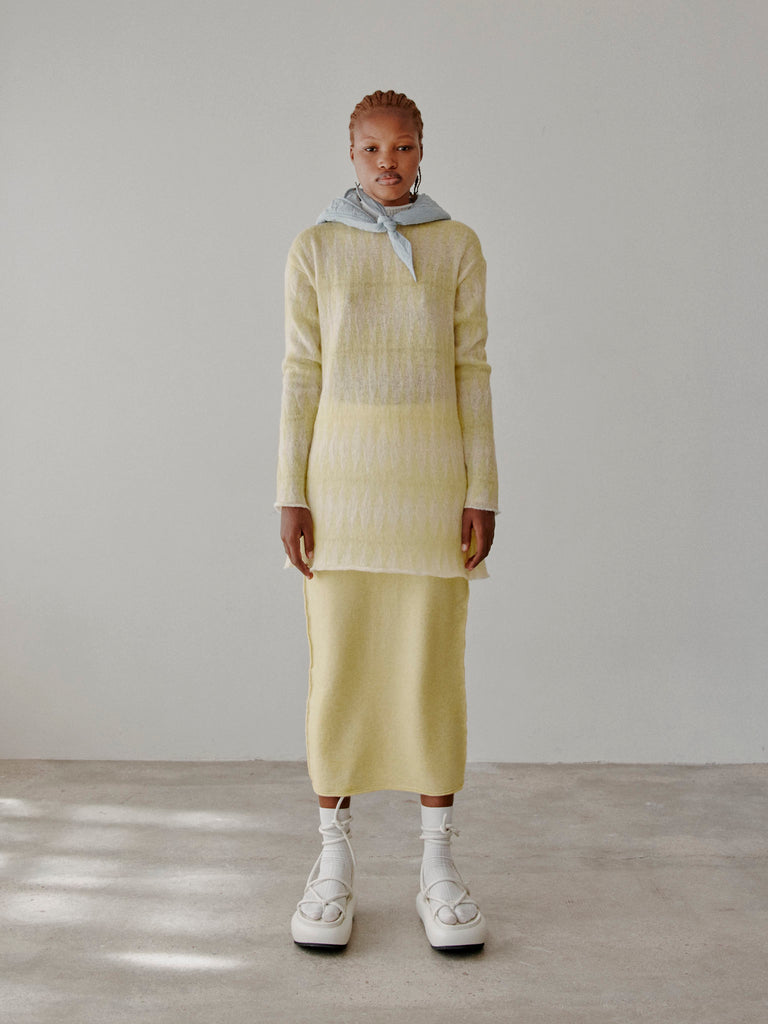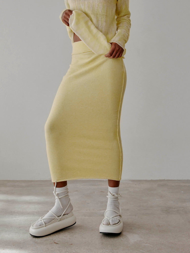 Midi skirt crafted from a soft and lightweight extrafine wool blend with a felted effect. Straight fit with a ribbed elasticated waistband with a rolled trim.