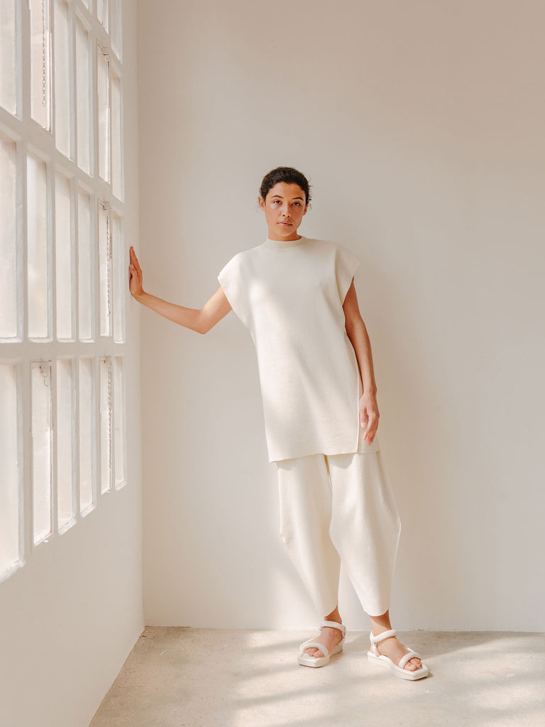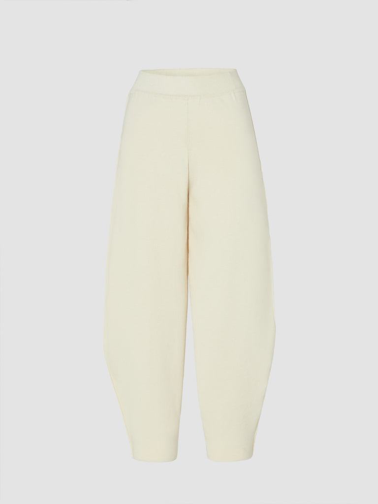 Rounded compact cotton pants Regular priceRounded leg pants crafted from a fine cotton blend in a compact knit. Relaxed fit featuring a ribbed elasticated waistband and exposed seams.