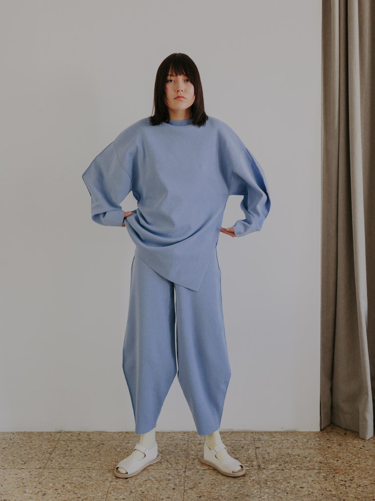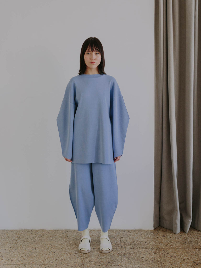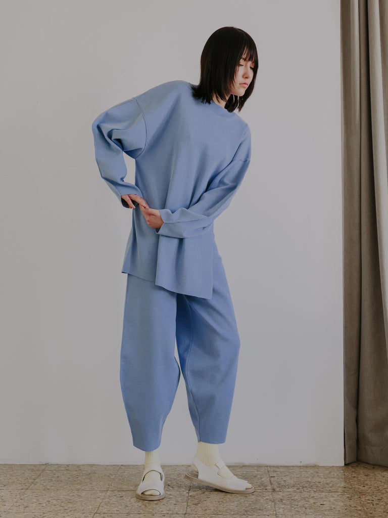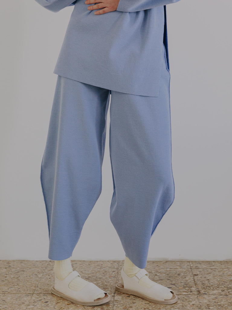 Rounded compact cotton pants Regular priceRounded leg pants crafted from a fine cotton blend in a compact knit. Relaxed fit featuring a ribbed elasticated waistband and exposed seams.