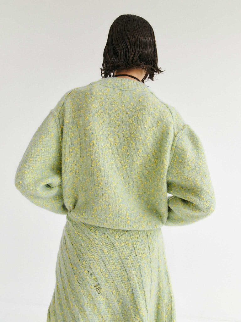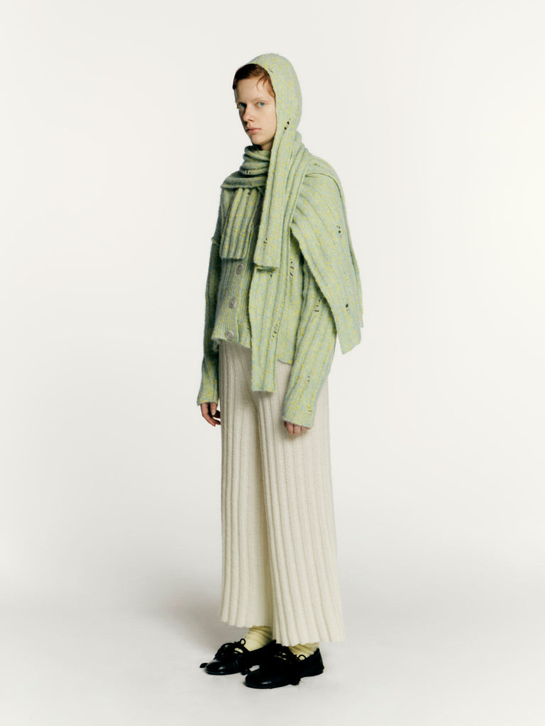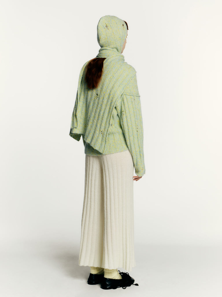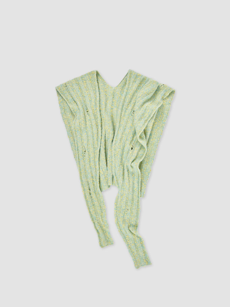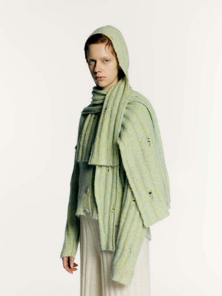 Ribbed asymmetric scarf knitted from a textured two-tone tweed yarn featuring distressed details. Designed for endless styling possibilities.