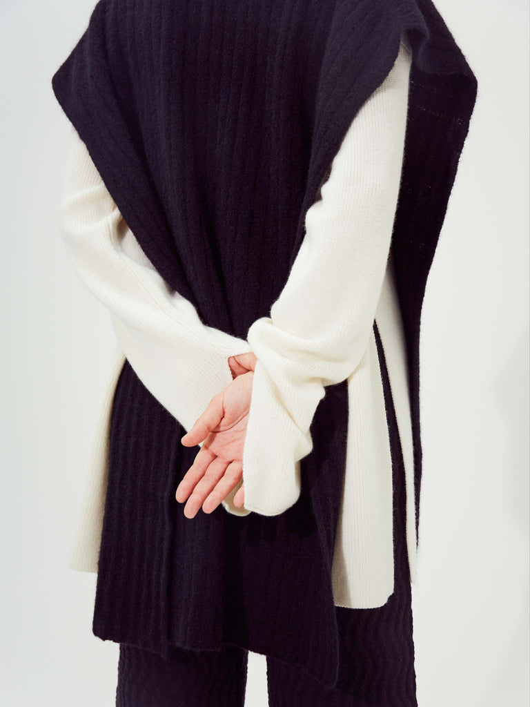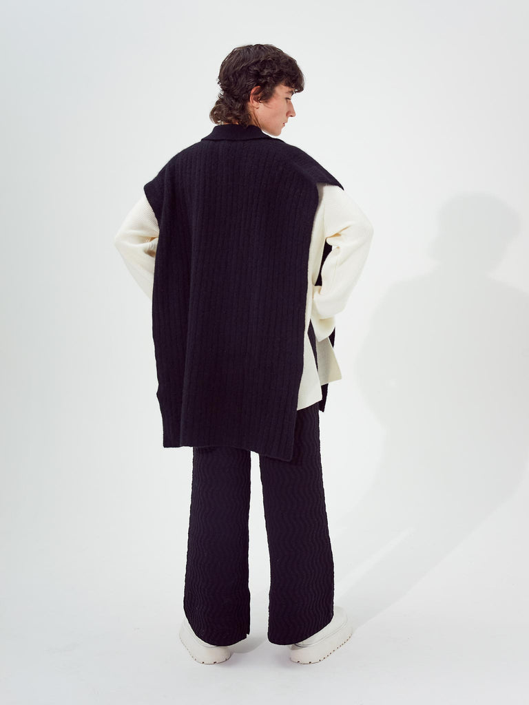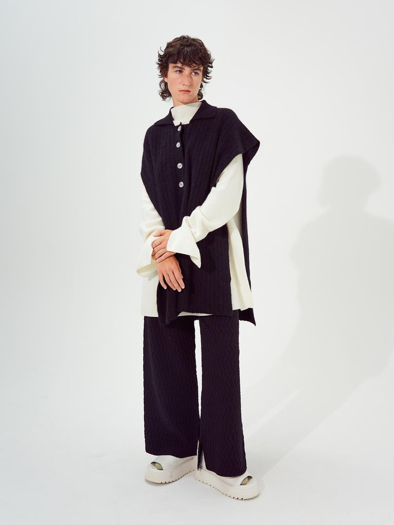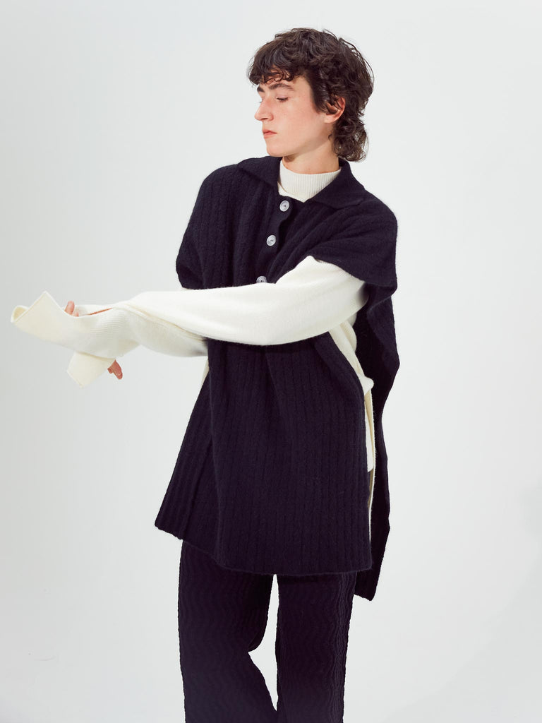 Ribbed polo vest knitted from a fuzzy alpaca wool blend yarn. Boxy silhouette with fully open side seams, featuring a ribbed pointed collar and buttoned front placket.