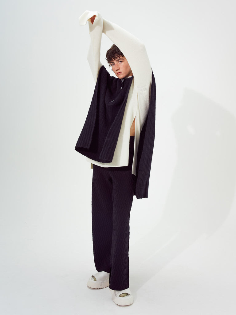 Ribbed polo vest Regular priceRibbed polo vest knitted from a fuzzy alpaca wool blend yarn. Boxy silhouette with fully open side seams, featuring a ribbed pointed collar and buttoned front placket.