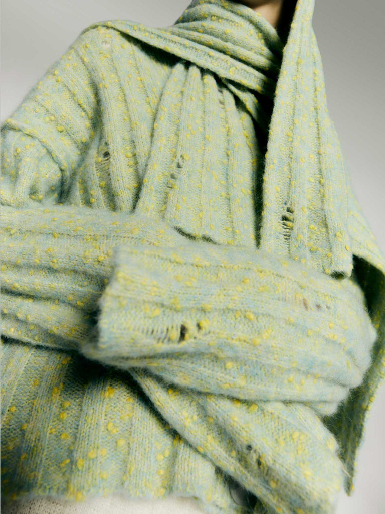 Ribbed buttoned cardigan knitted from a textured two-tone tweed yarn. Relaxed boxy silhouette featuring distressed details and exposed seams.