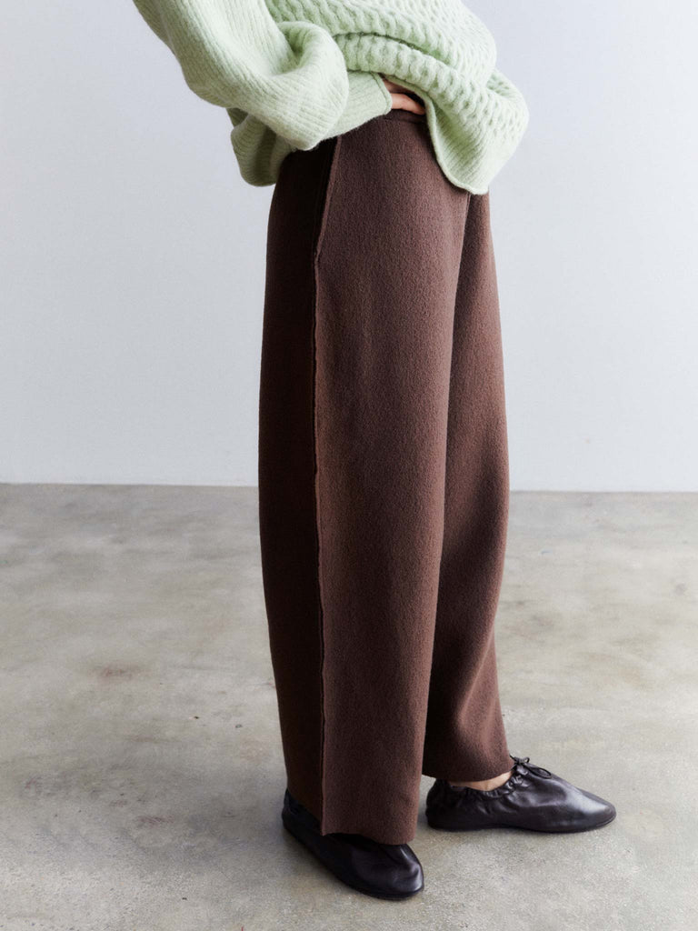 Wool felted pants Regular priceStraight-leg pants crafted from crafted from boiled merino wool. Relaxed fit featuring exposed seams, side pockets and a ribbed elasticated waistband.