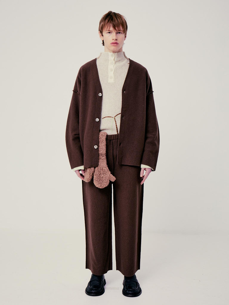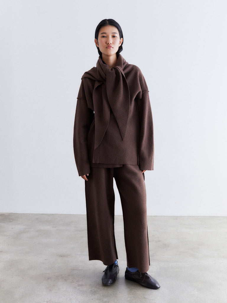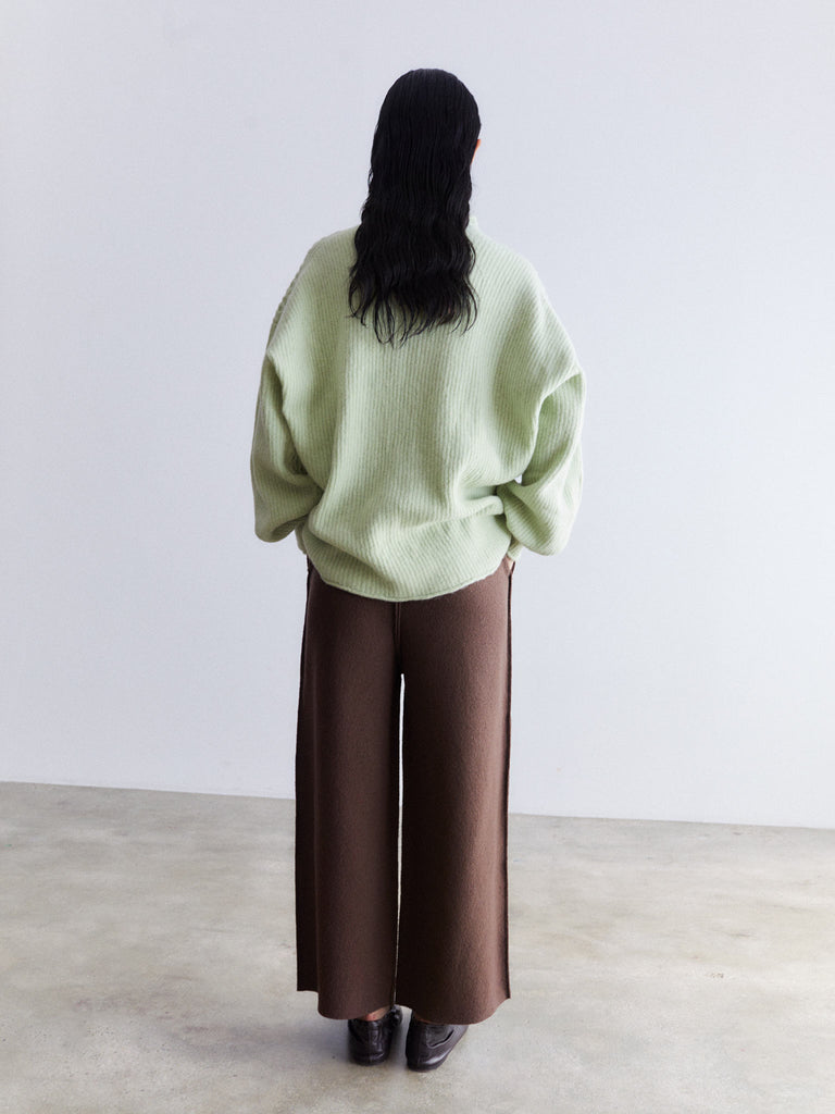 This felted wool effect is achieved simply by washing the knit with warm water, which causes the wool fiber to shrink and felt while keeping its original softness and lightness. Merino wool is known for extreme softness on skin since its fibers are much finer than other types of breeds, enabling them to bend more. It is a completely renewable fiber source, naturally breathable and anti-bacterial. Our merino wool is sourced from Australian merino sheep and later spun in Italy by the most experienced mills, who ensure the animal health and welfare in mostly family owned and operated farms.