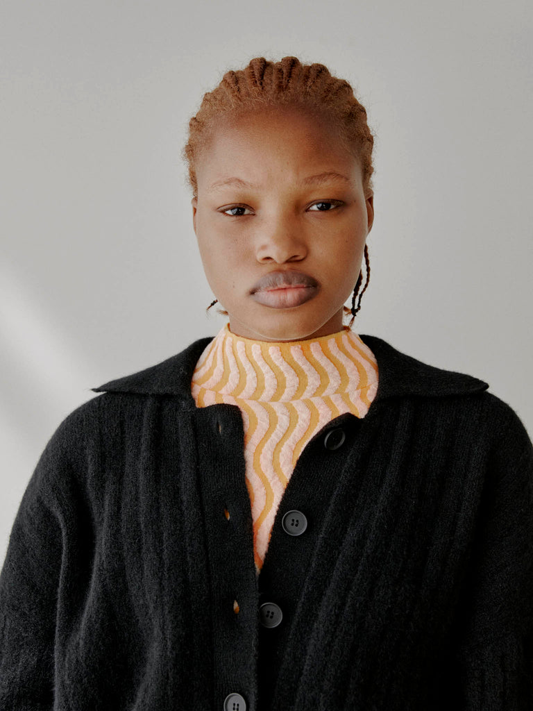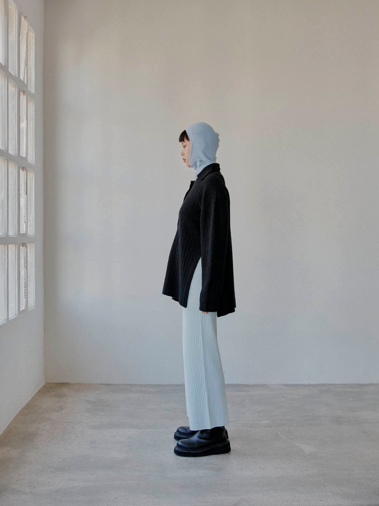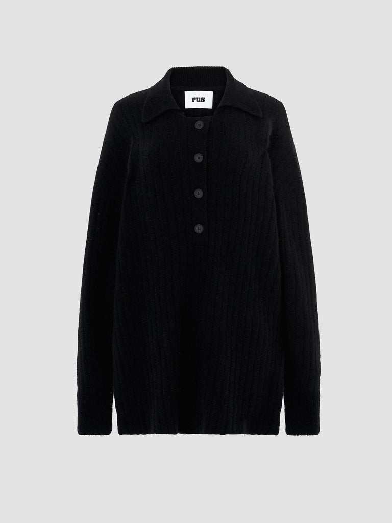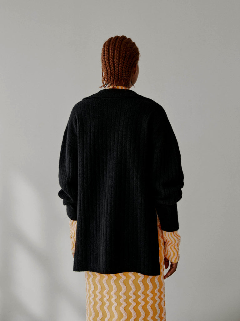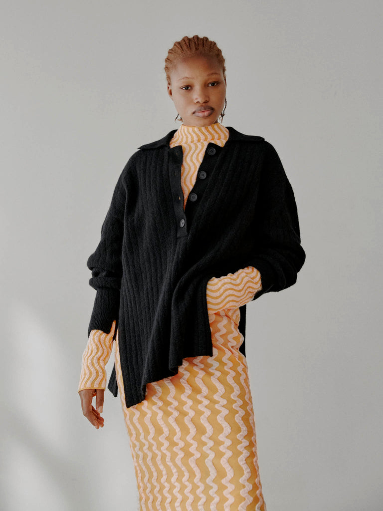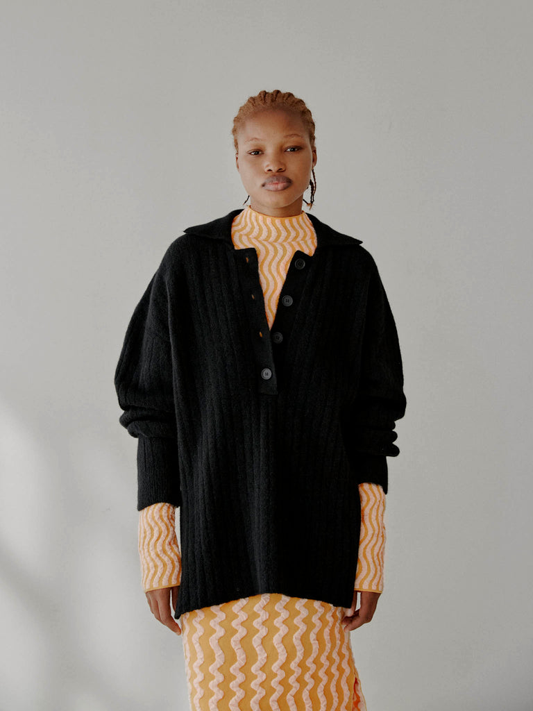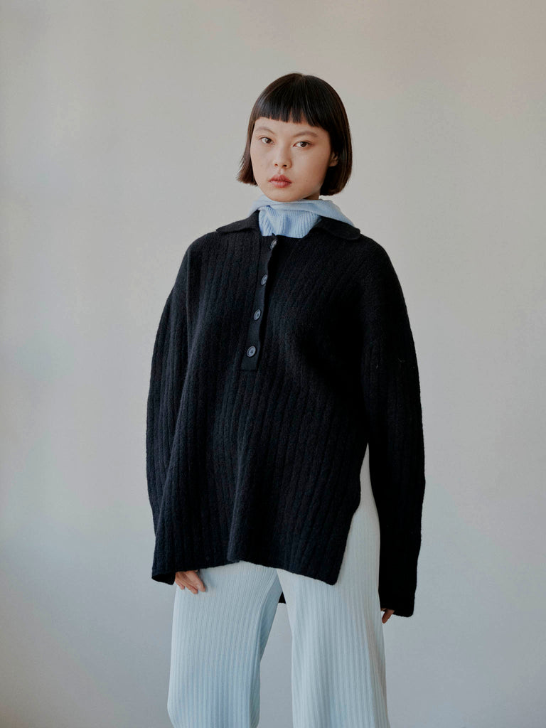 Ribbed polo sweater knitted from a fuzzy alpaca-wool blend yarn. Designed for a relaxed fit with ample sleeves and deep side splits, featuring a ribbed pointed collar and buttoned front placket.