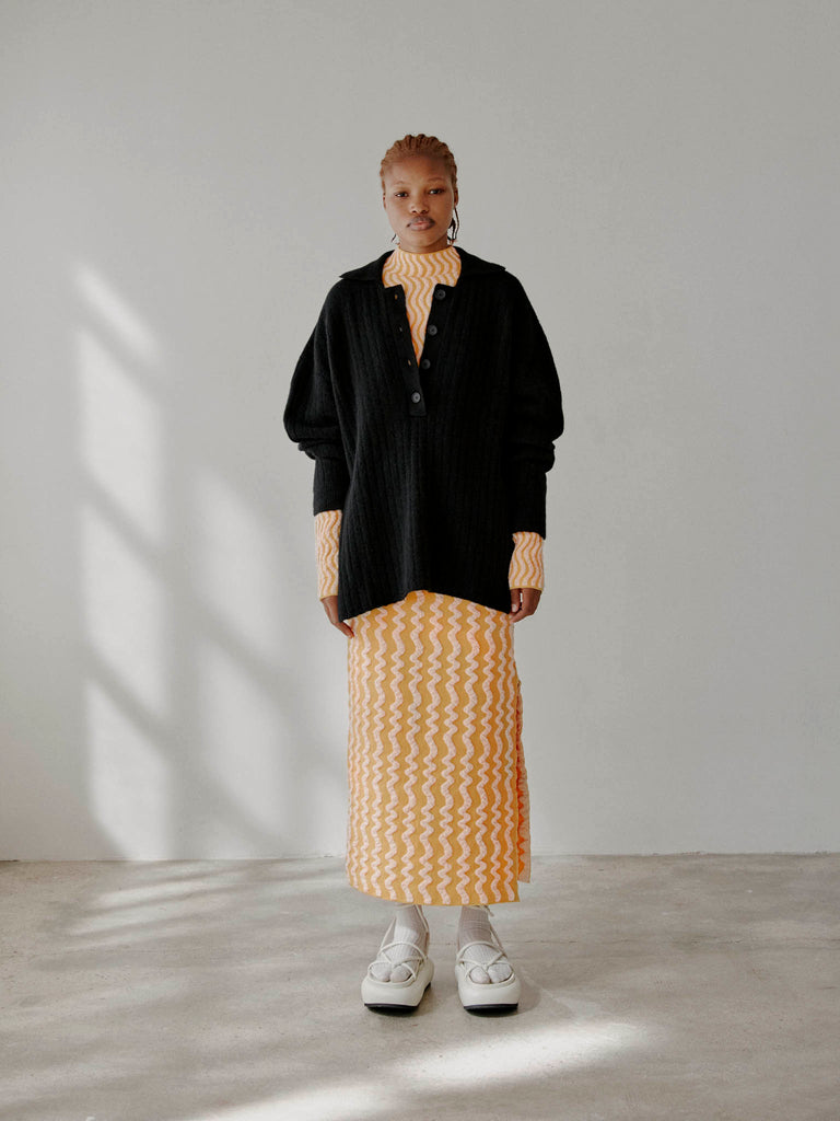 Ribbed polo sweater Regular priceRibbed polo sweater knitted from a fuzzy alpaca-wool blend yarn. Designed for a relaxed fit with ample sleeves and deep side splits, featuring a ribbed pointed collar and buttoned front placket.