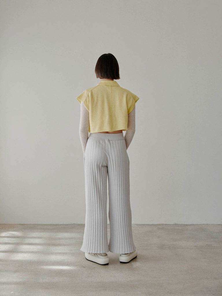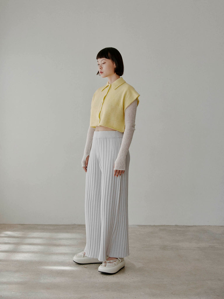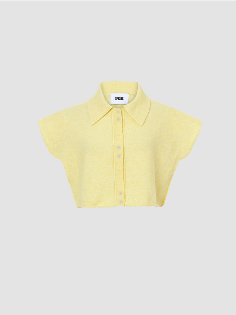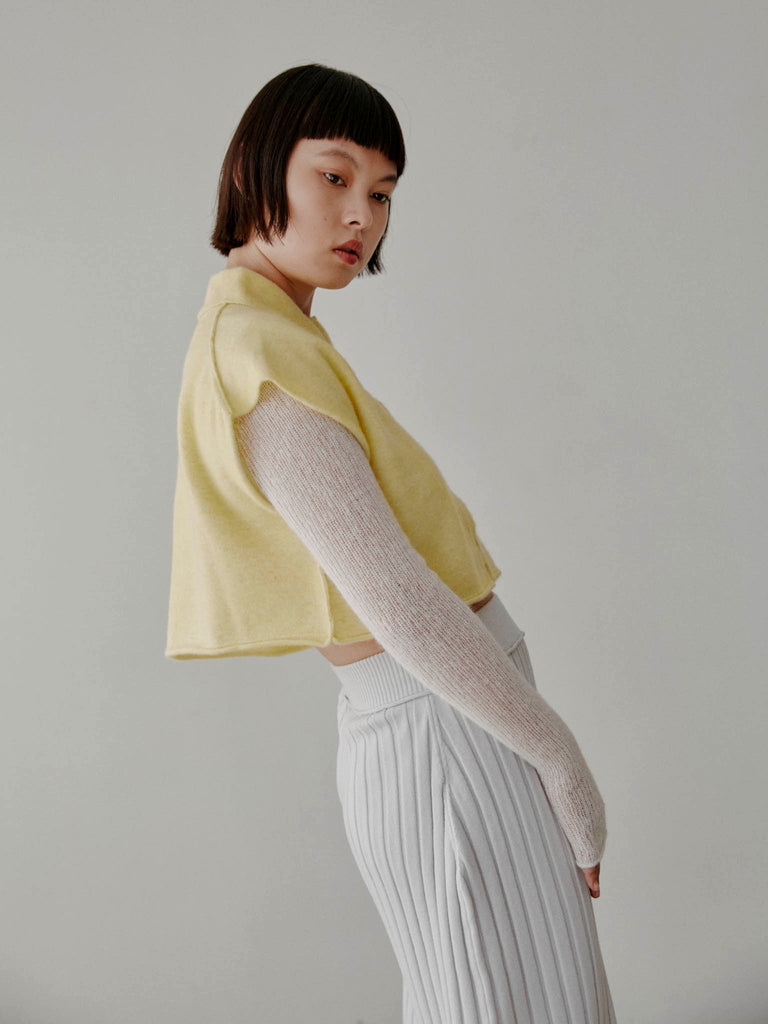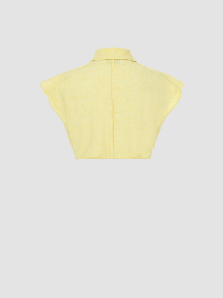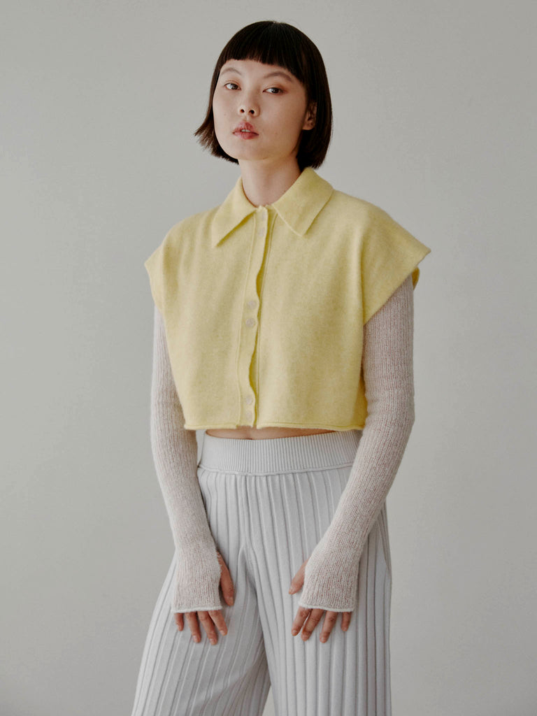 Boxy polo vest crafted from a soft and lightweight extrafine wool blend with a felted effect. Featuring a cropped hem with a rolled trim and exposed seams, a ribbed pointed collar and a buttoned front placket.