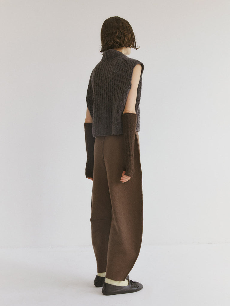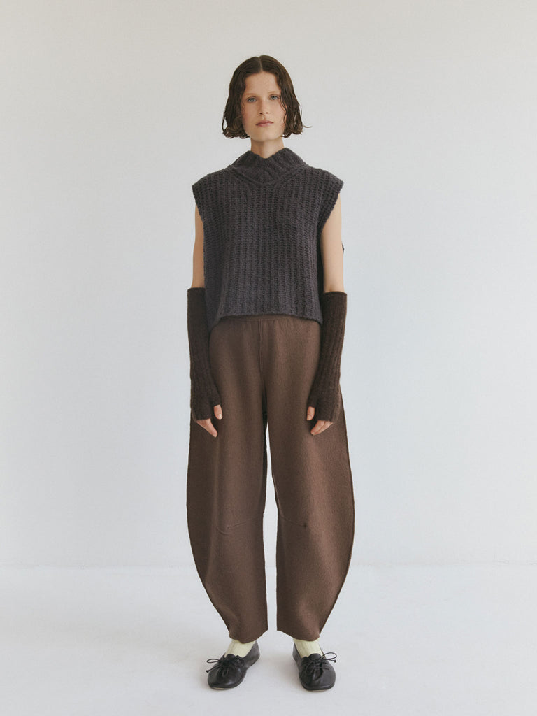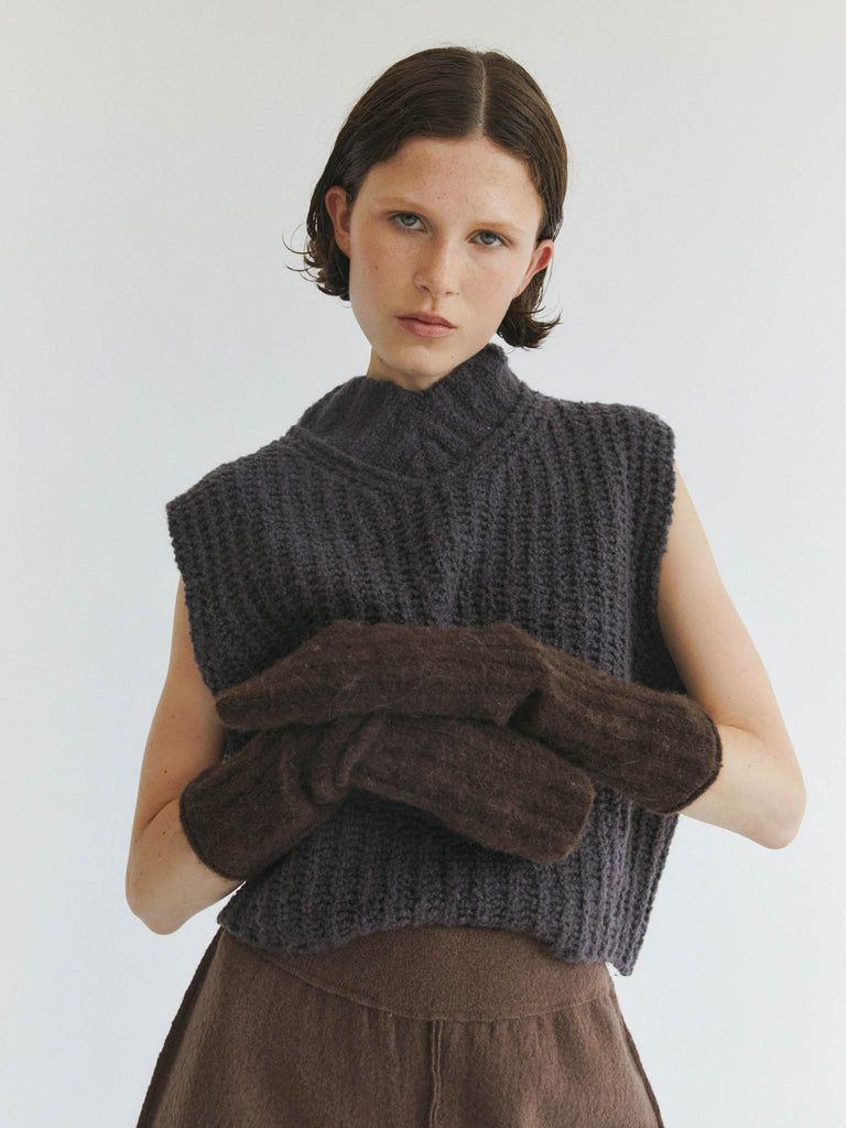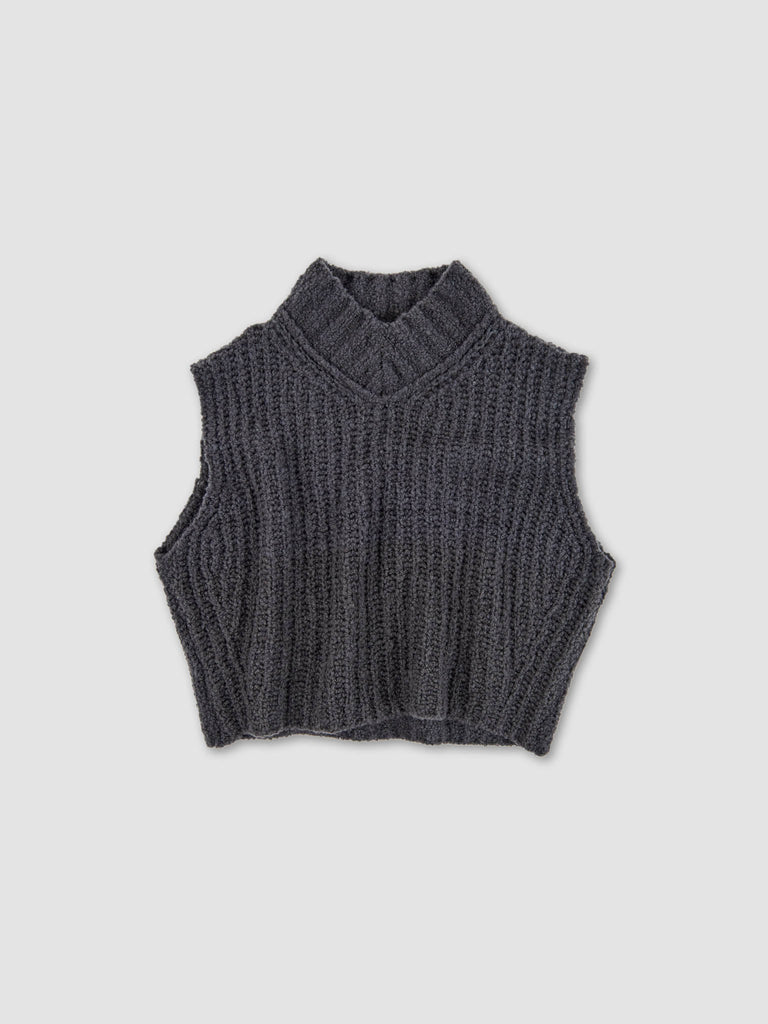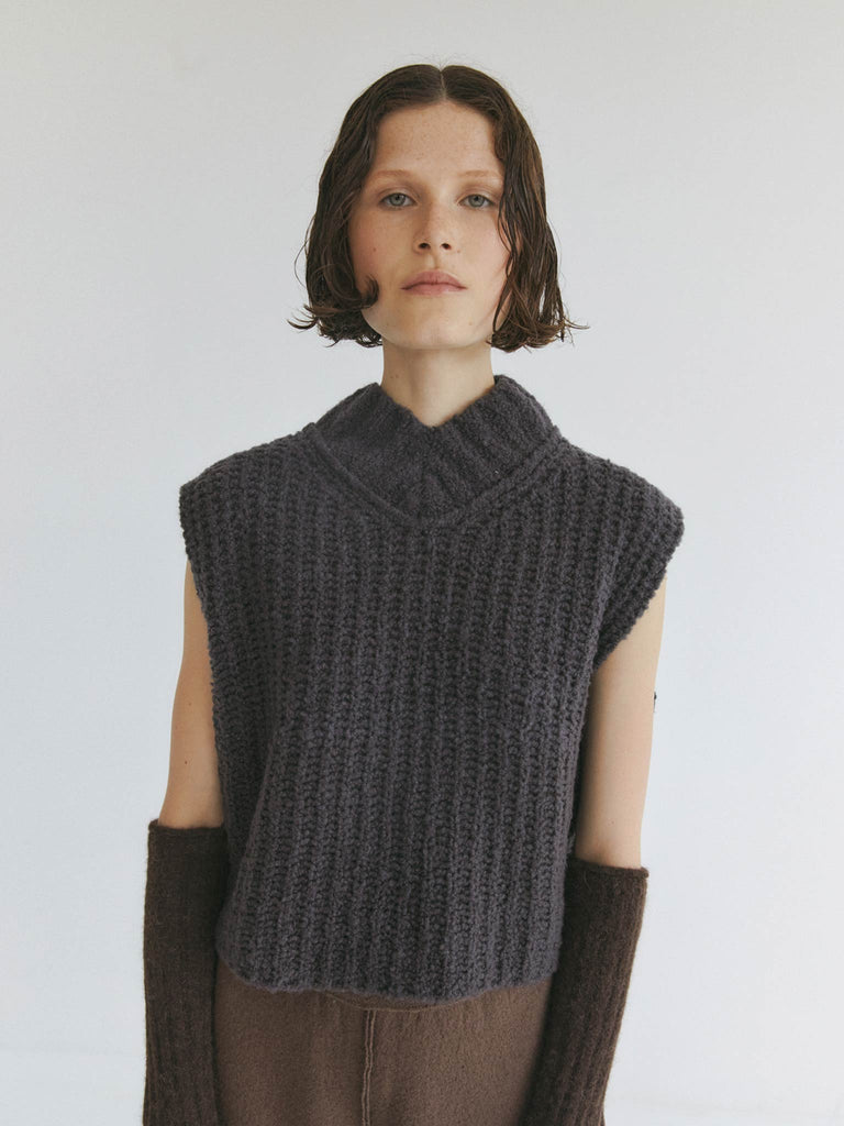 Ribbed v-neck vest knitted from a soft and airy wool bouclé. Slightly cropped silhouette, featuring fully-fashioned details and a wide neck trim. Perfect to be layered over a fine knit.