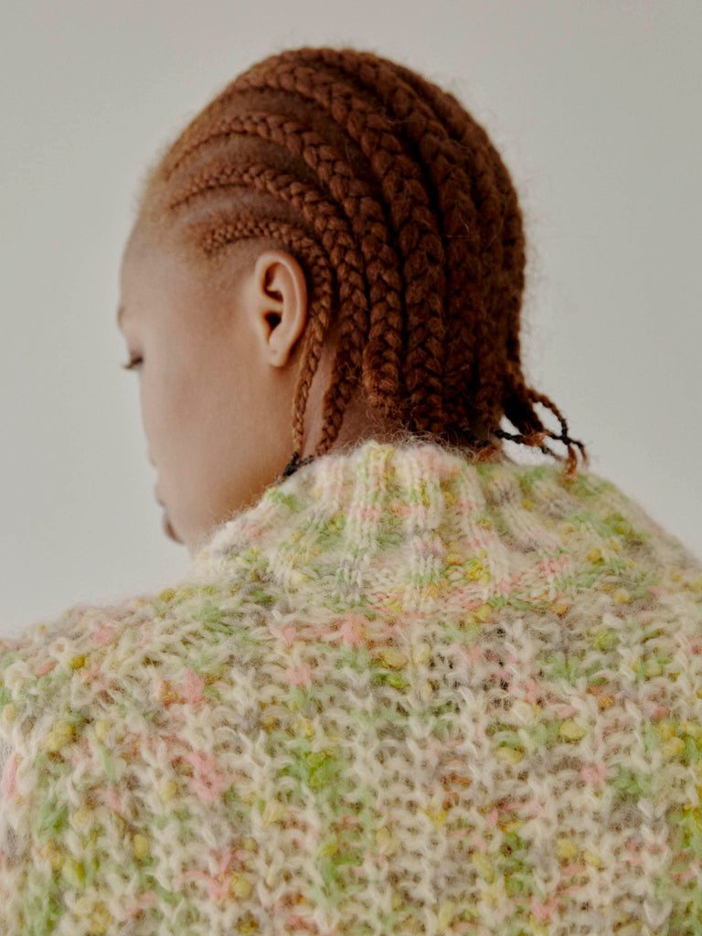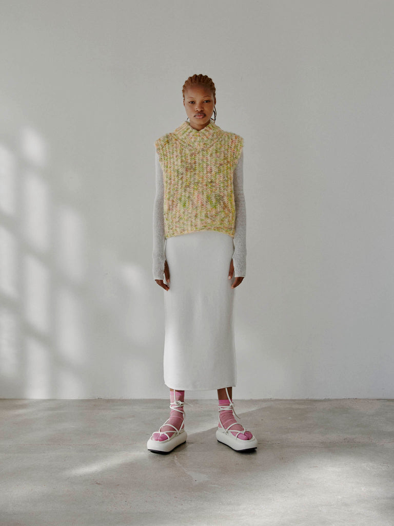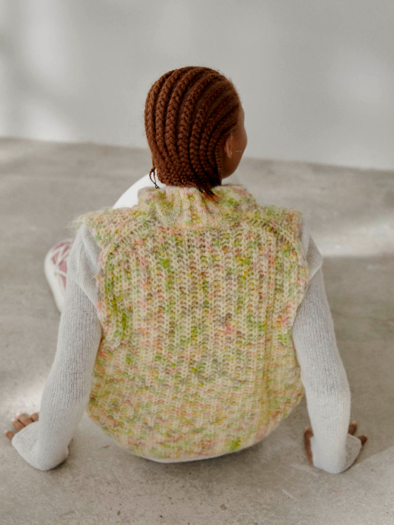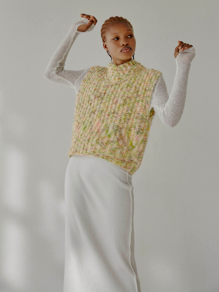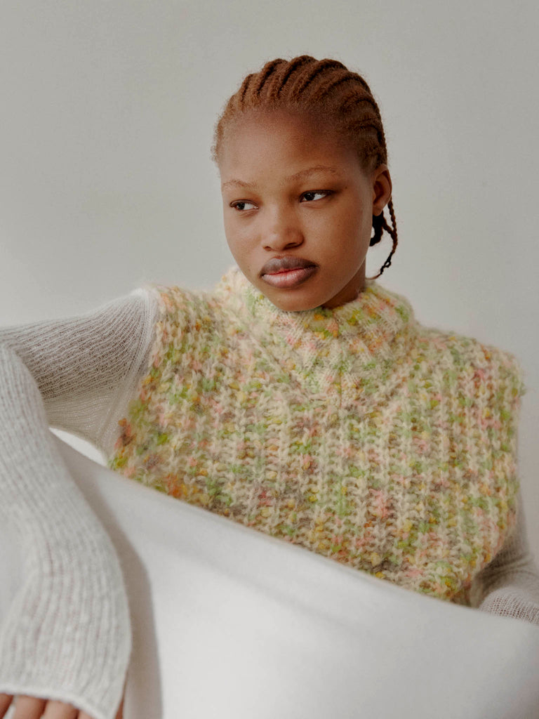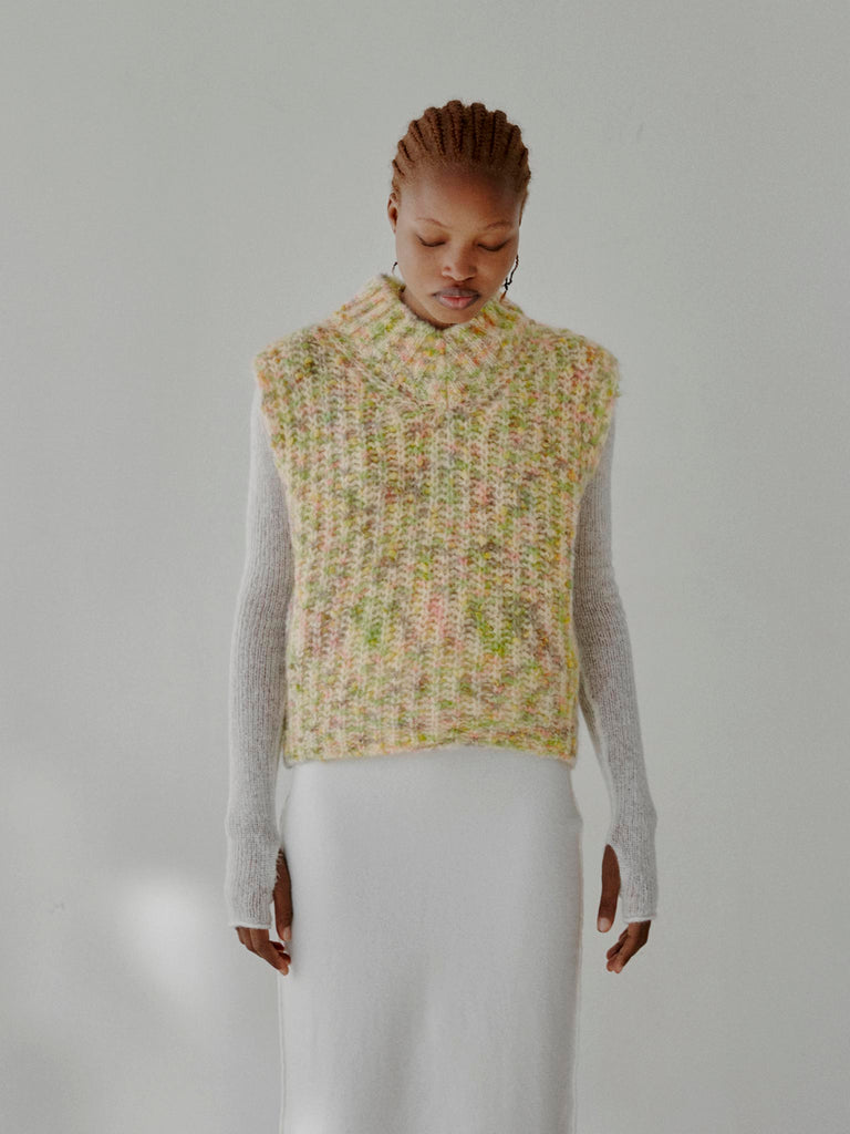 Ribbed v-neck vest knitted from a soft and airy multicolor tweed yarn. Slightly cropped silhouette, featuring fully-fashioned details and a wide neck trim. Perfect to be layered over a fine knit.