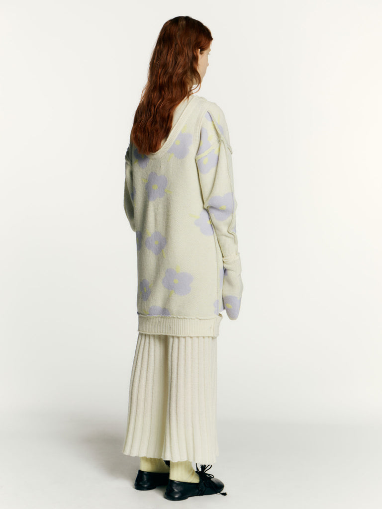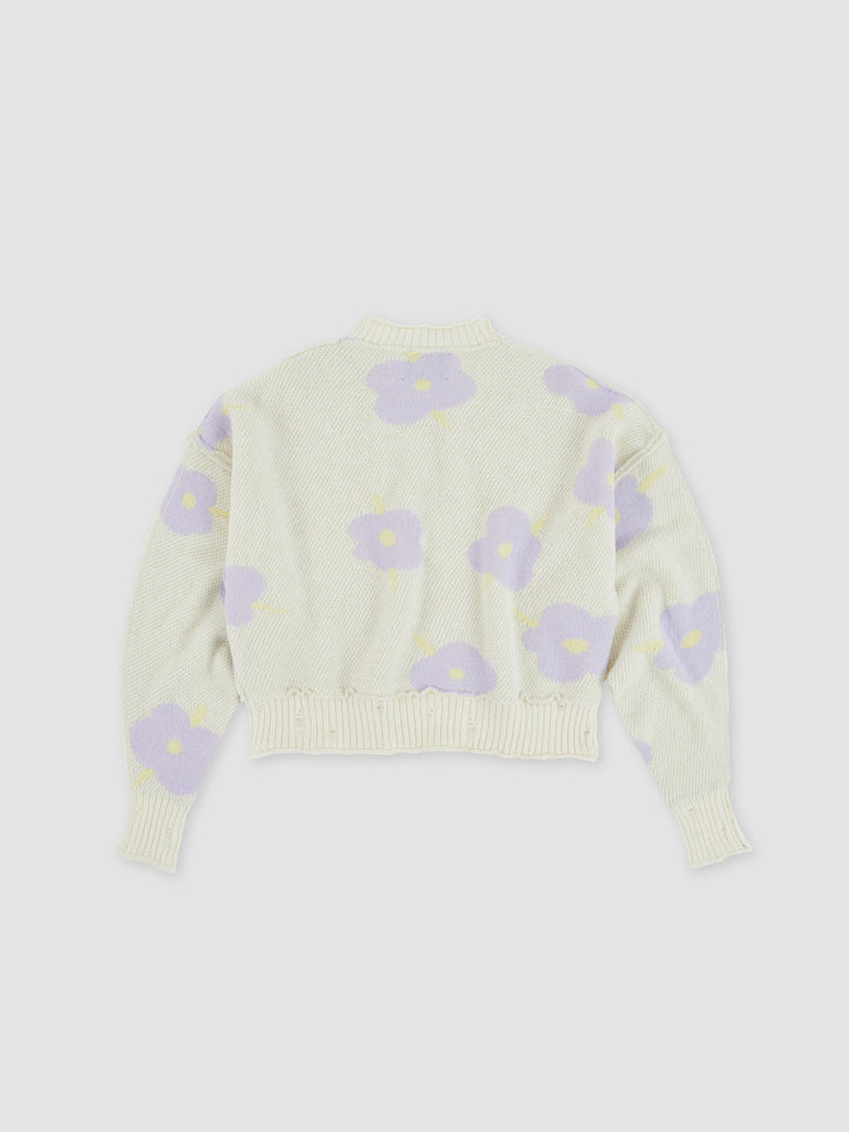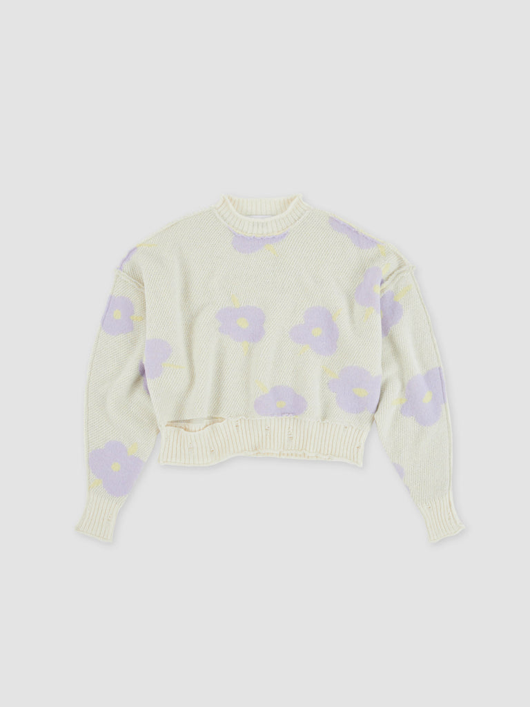 Floral jacquard sweater Regular priceFuzzy sweater crafted in a textured floral motif jacquard knitted from a baby alpaca blend. Relaxed slightly cropped silhouette featuring distressed details, exposed seams and rounded ample sleeves.