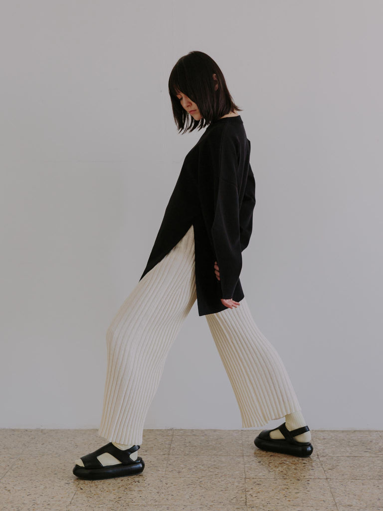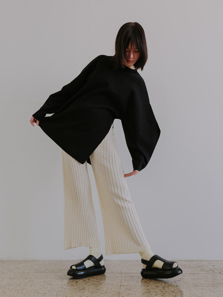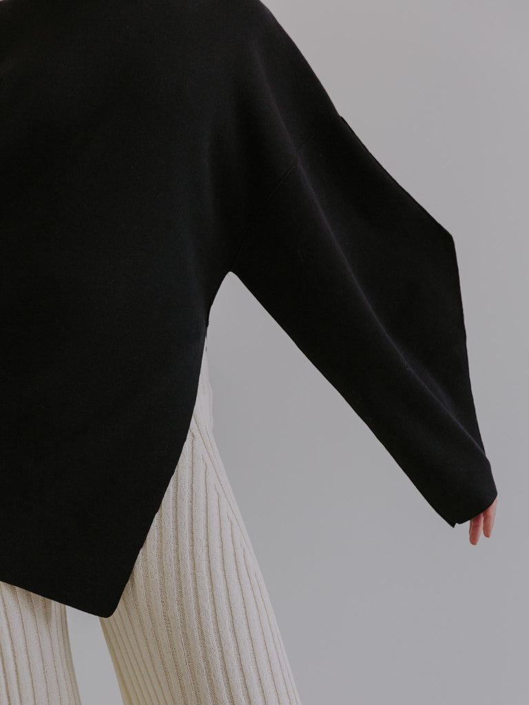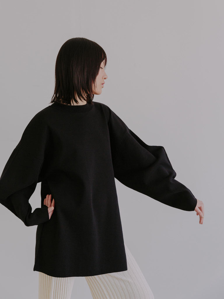 Elongated crewneck sweater crafted from a fine organic cotton blend in a compact knit. Relaxed silhouette, ample structured sleeves featuring exposed seams, a ribbed collar and a deep asymmetrical side slit.