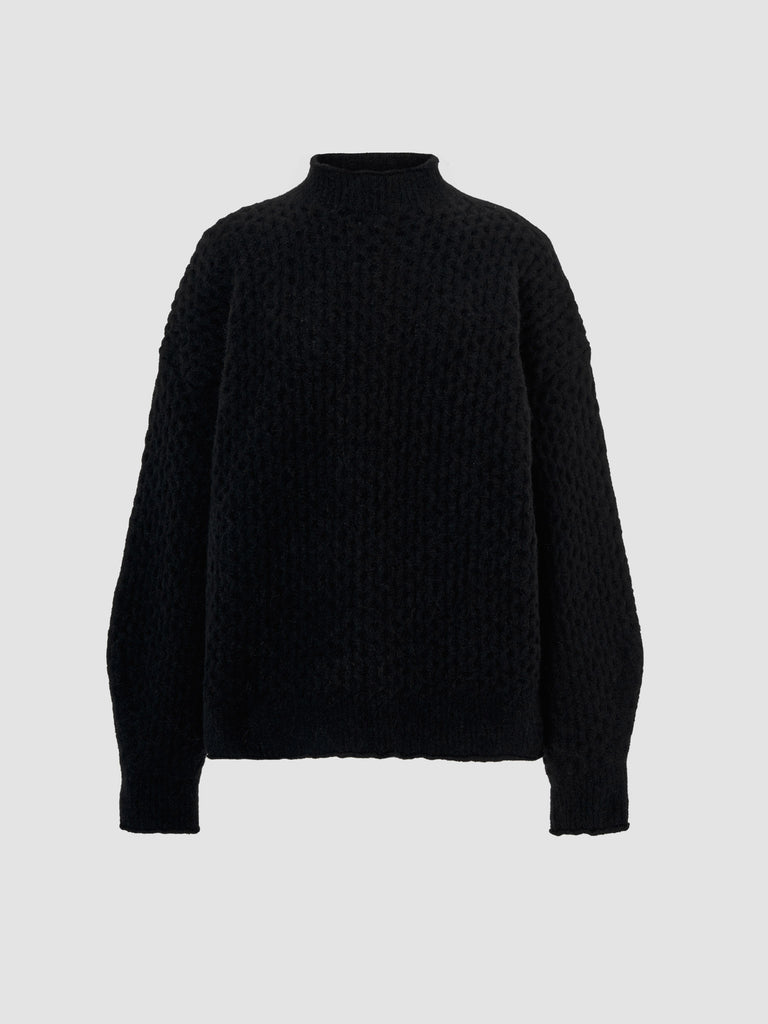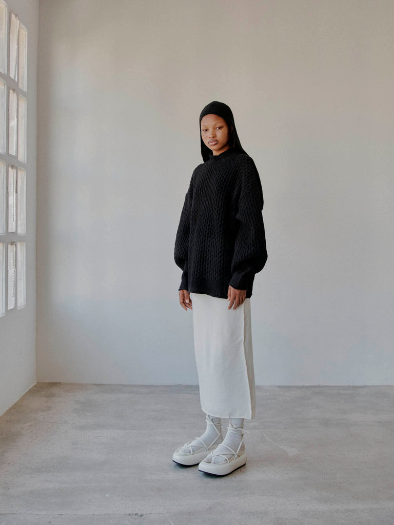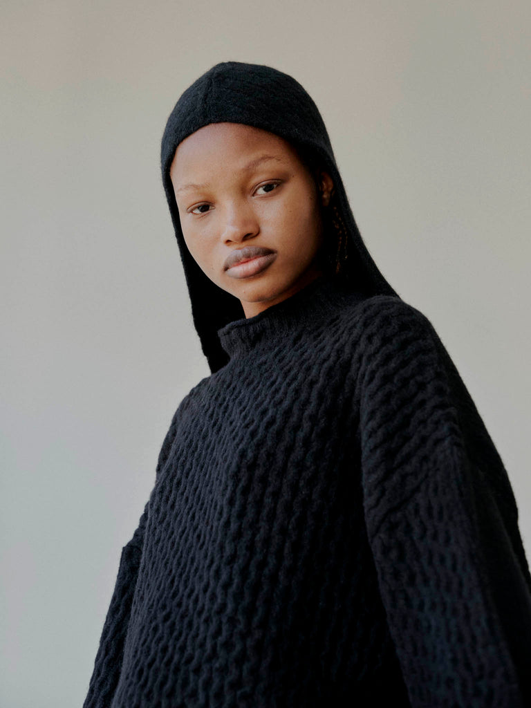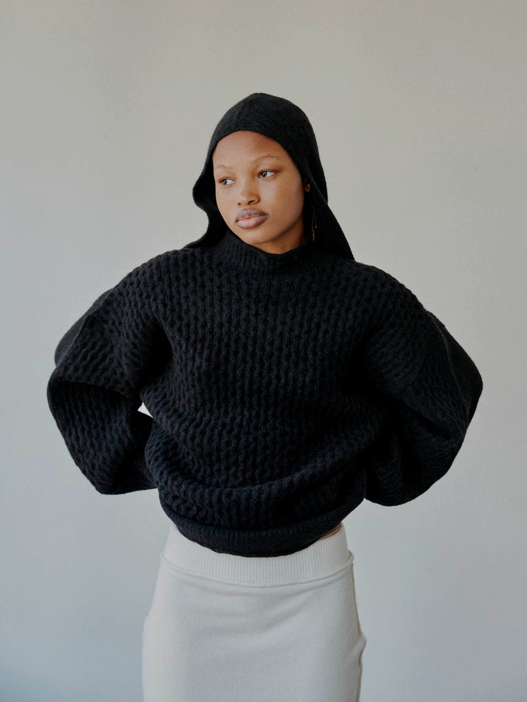 Relaxed-fit cable knit sweater crafted from the softest baby alpaca blend. Slightly oversized,it features a ribbed crewneck, generously rounded sleeves, and a ribbed stitch detail on the back for added texture.