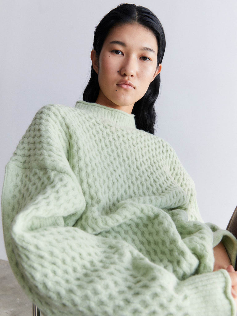 Fuzzy cable sweater Regular priceRelaxed-fit cable knit sweater crafted from the softest baby alpaca blend. Slightly oversized,it features a ribbed crewneck, generously rounded sleeves, and a ribbed stitch detail on the back for added texture.