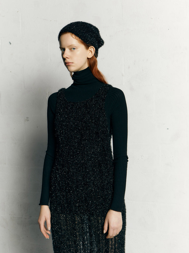 Beanie knitted from a shimmery and slightly fuzzy fancy yarn.