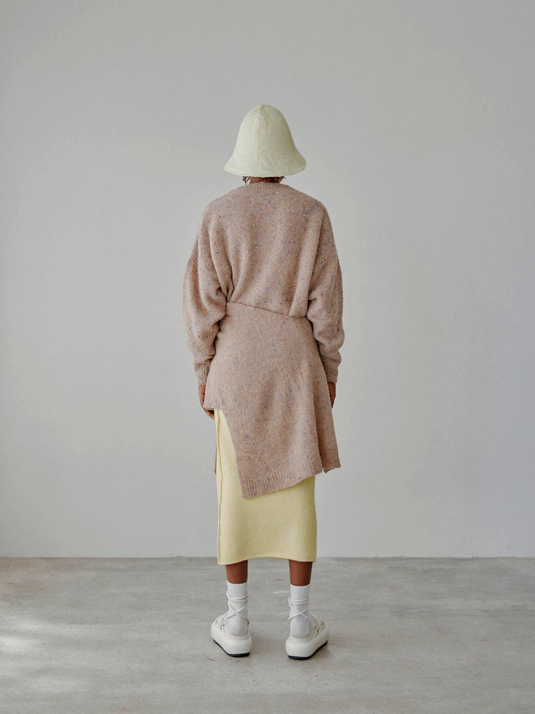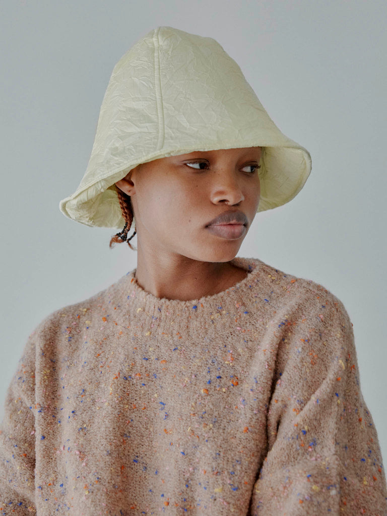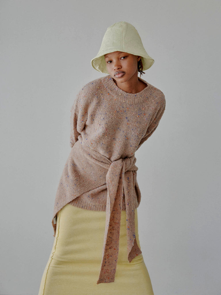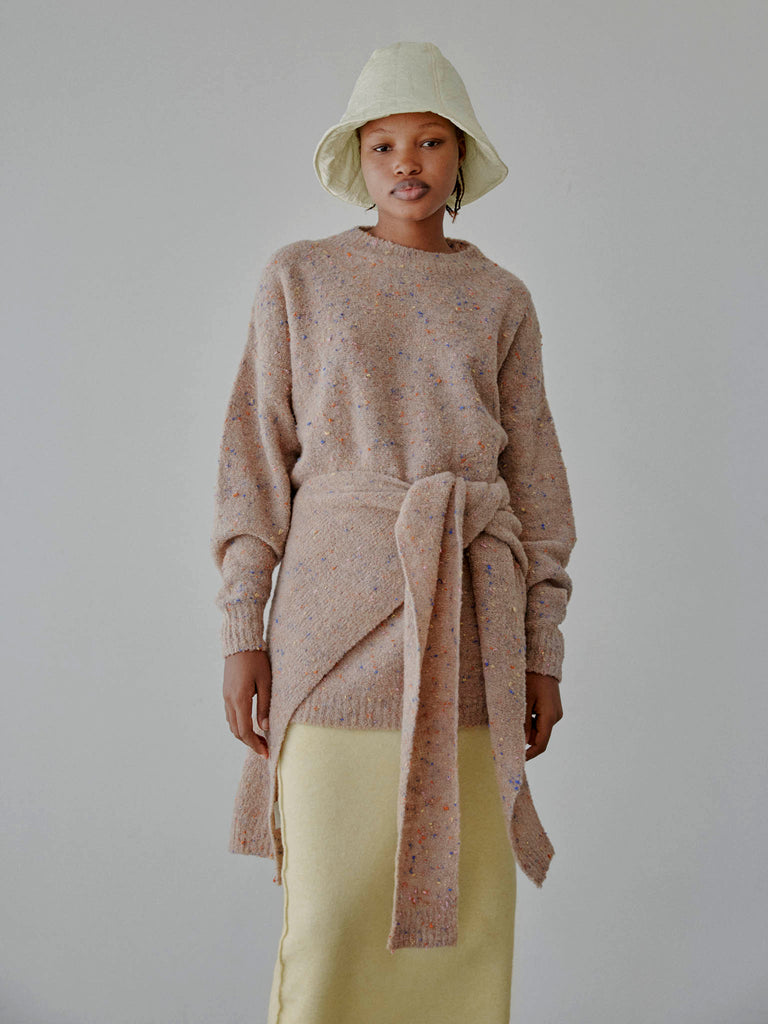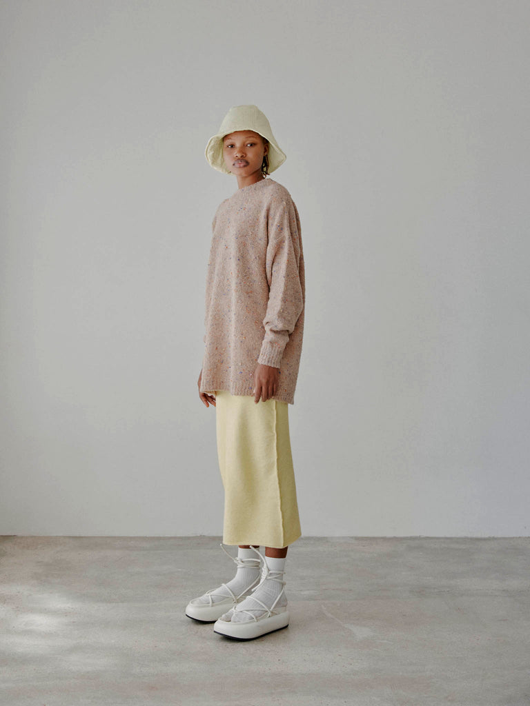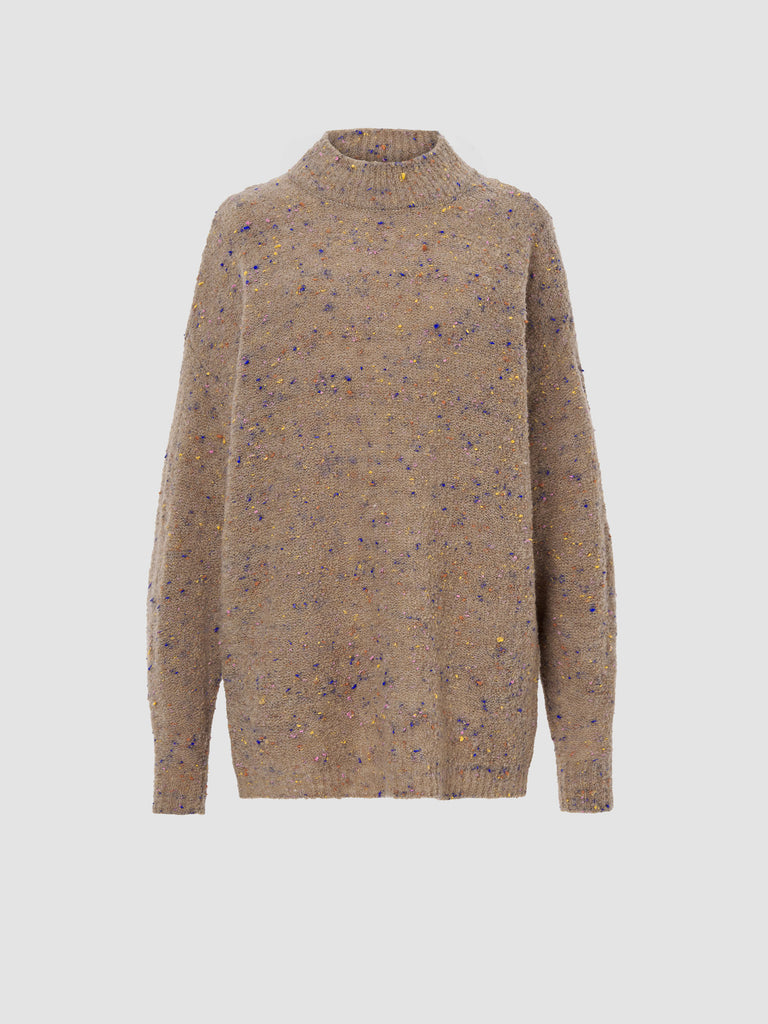 Textured crewneck sweater knitted from a lightweight speckled merino wool bouclé yarn. Relaxed boxy silhouette with a wide neck trim and rounded sleeves.