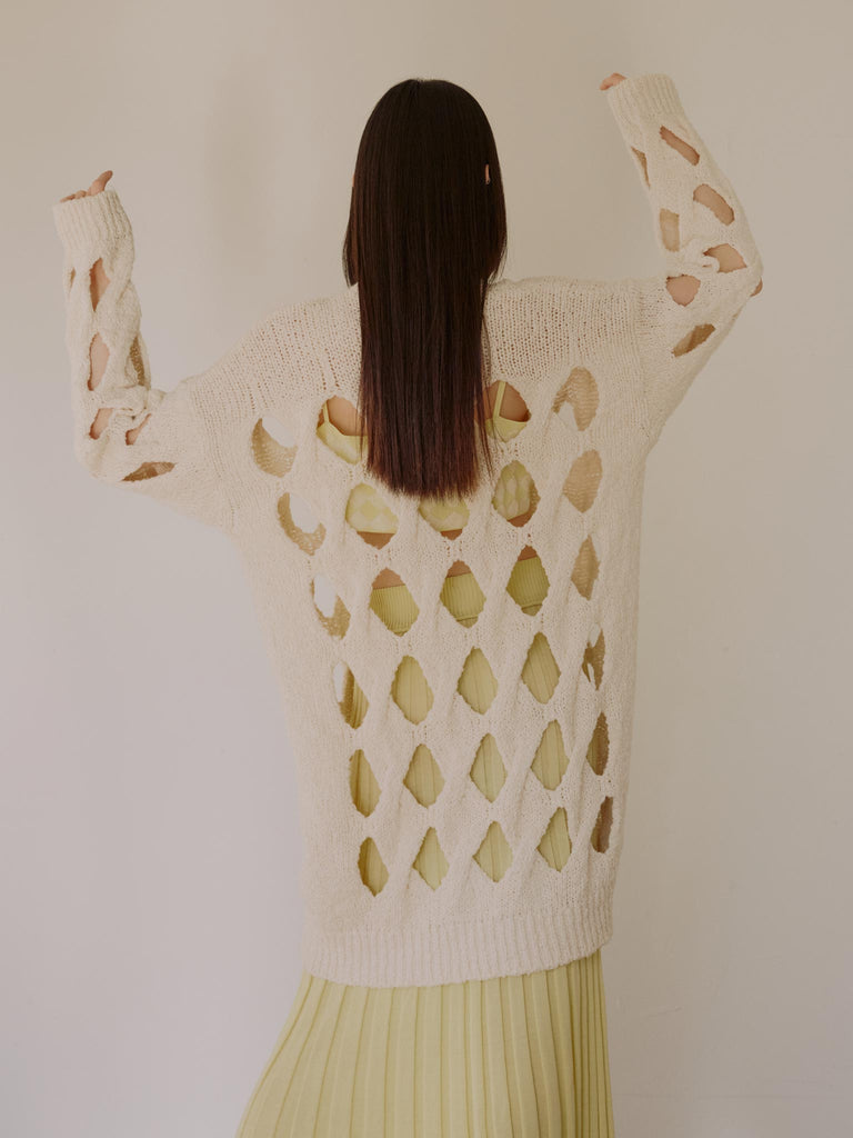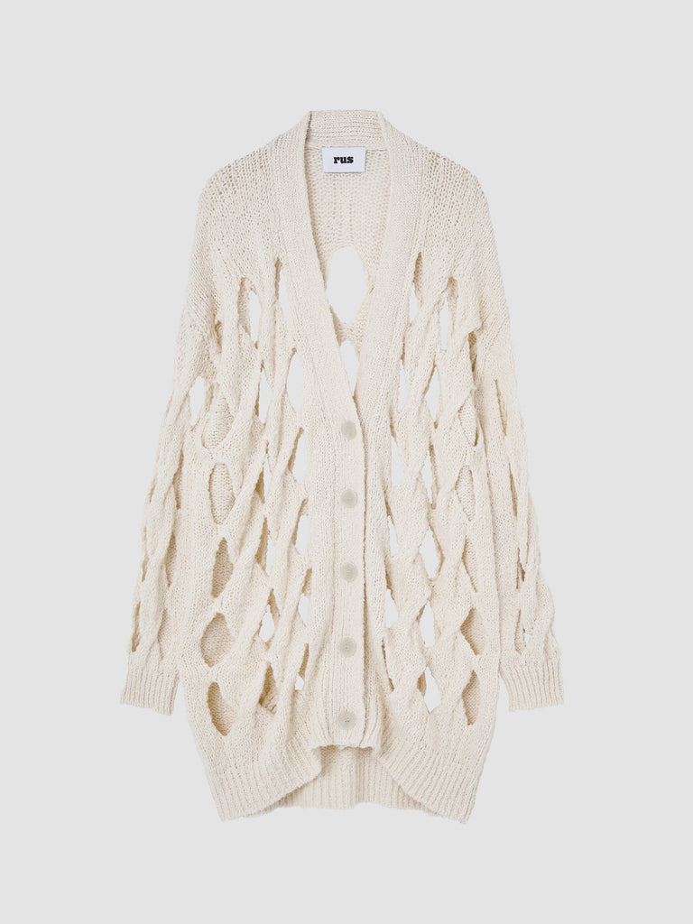 Open cable cardigan knitted from a soft organic cotton tape yarn. Relaxed elongated silhouette featuring exaggerated cables, a deep v-neck with a buttoned front placket, and ribbed hem and cuffs.