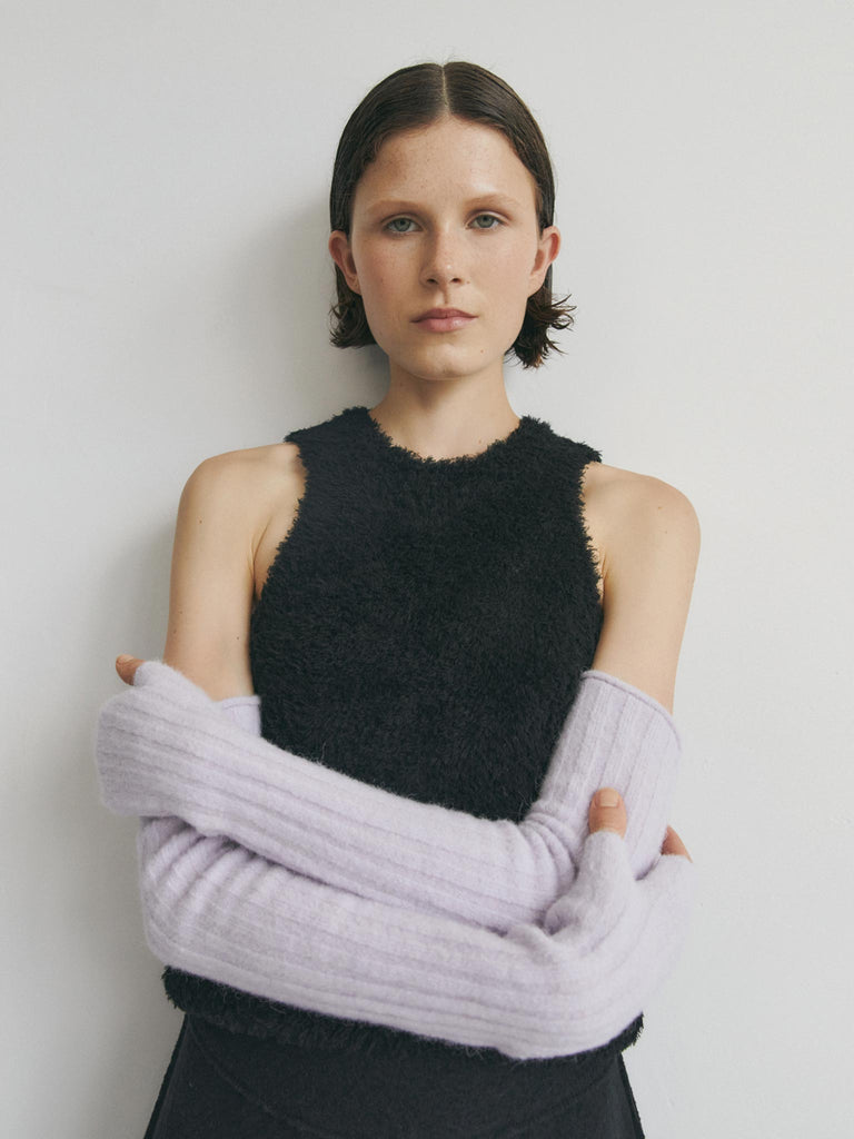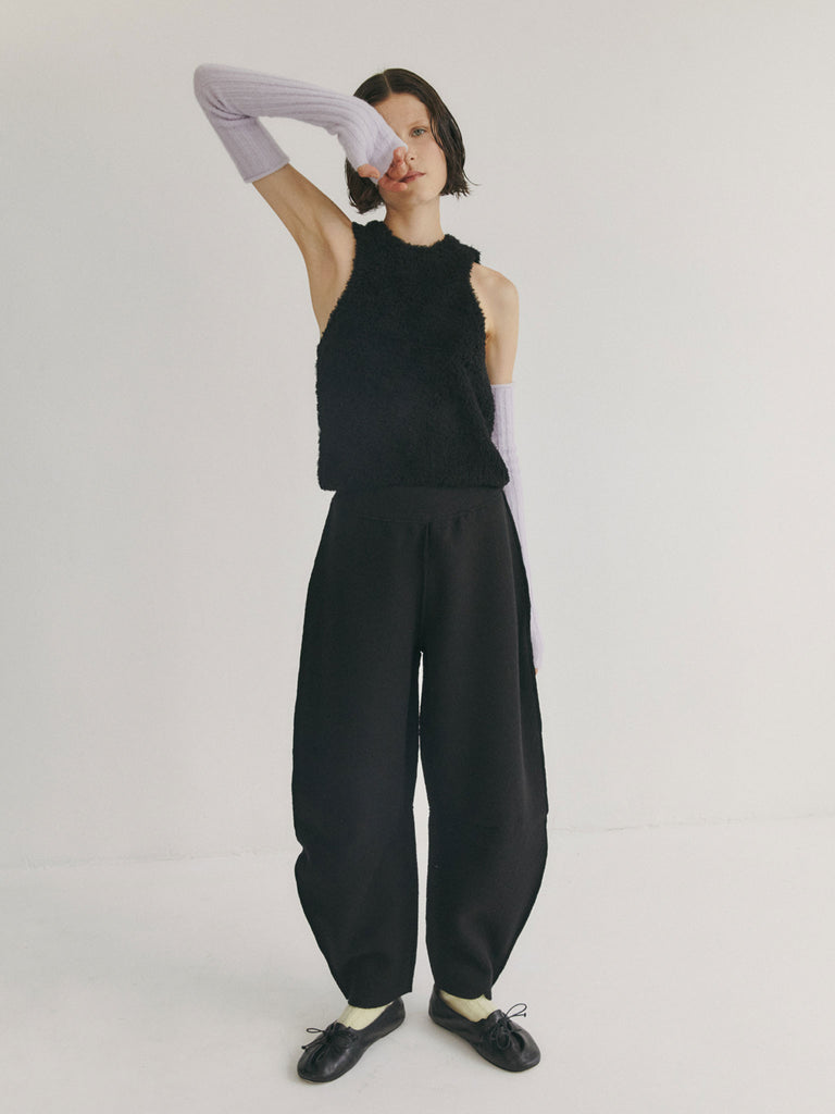 Sleeveless crewneck top knitted from soft and fluffy cotton with a rich texture.