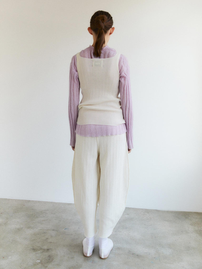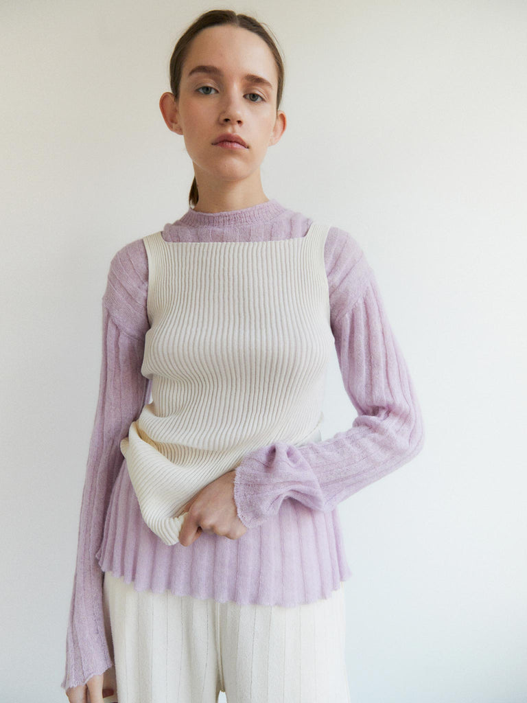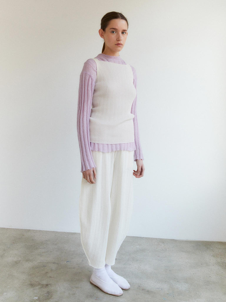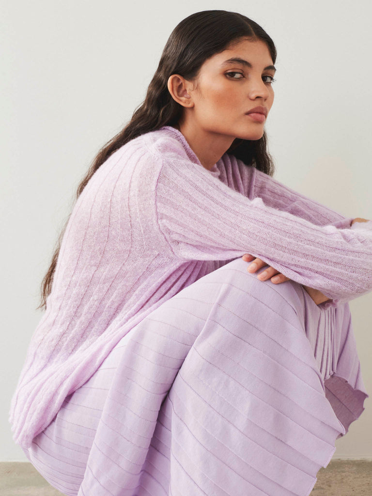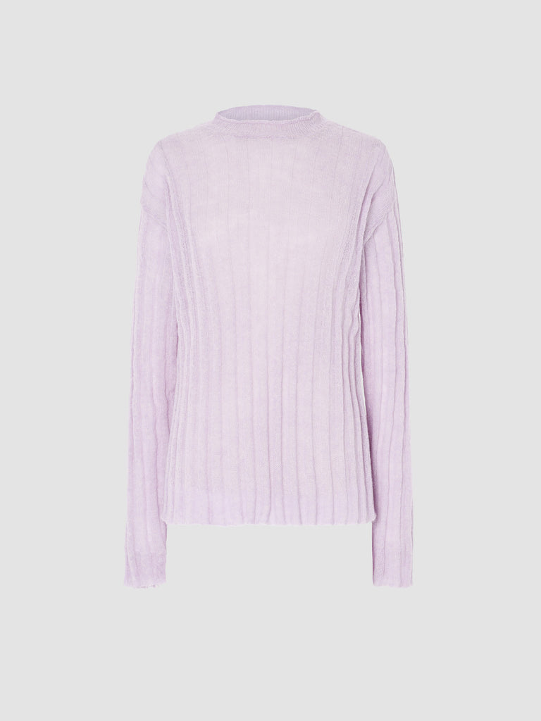 Fine sweater knitted from a soft textured cotton-mohair blend featuring wide ribs all over. Light and airy with a relaxed silhouette and slightly dropped shoulders. Versatile and perfect to be layered over or under.