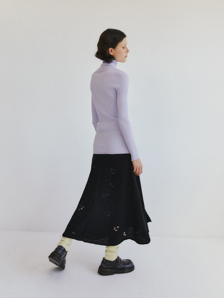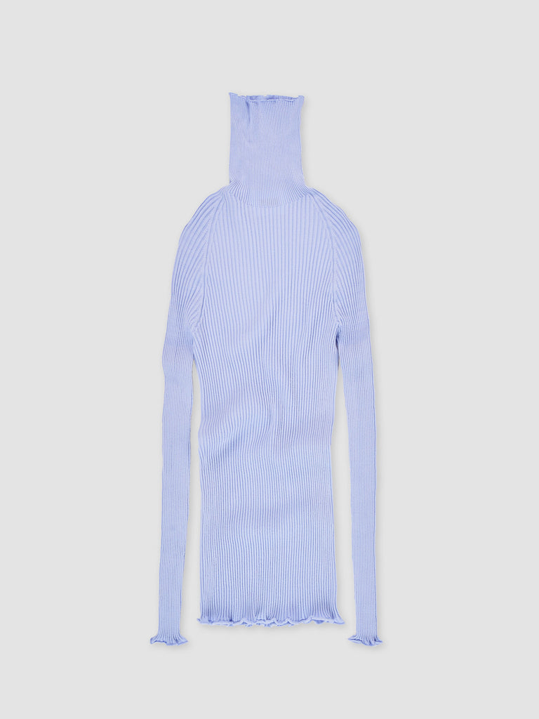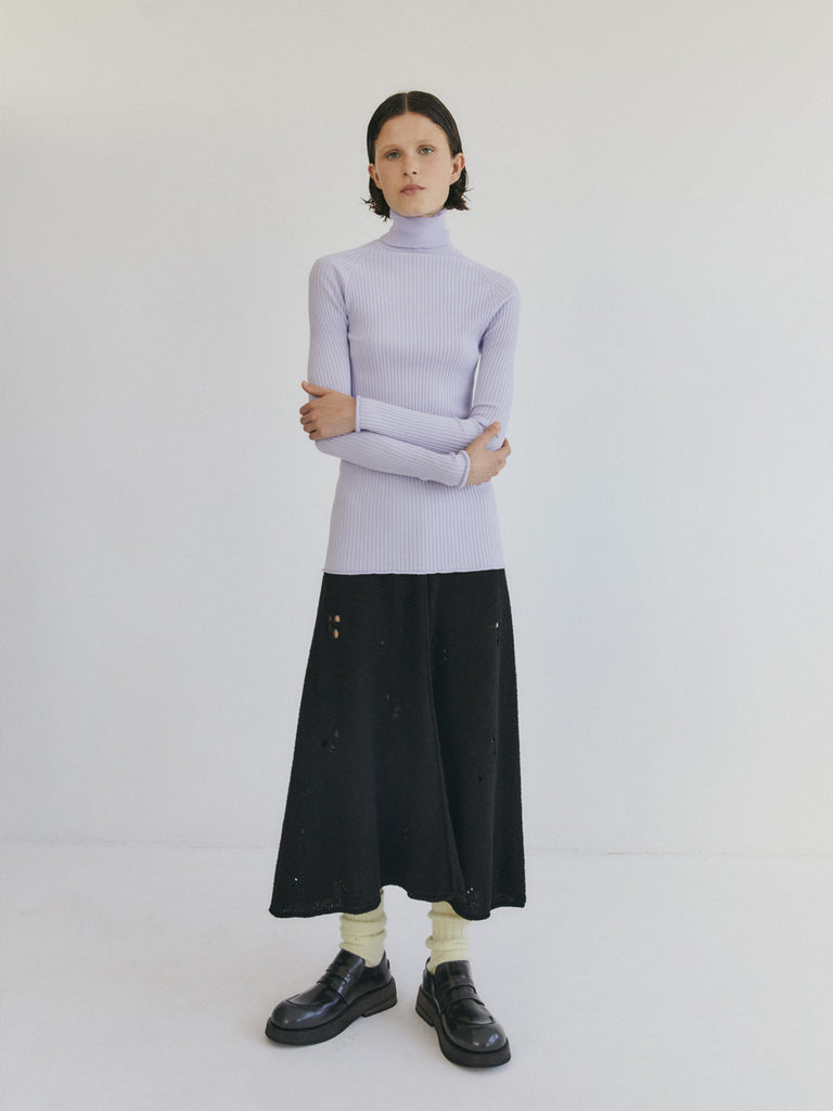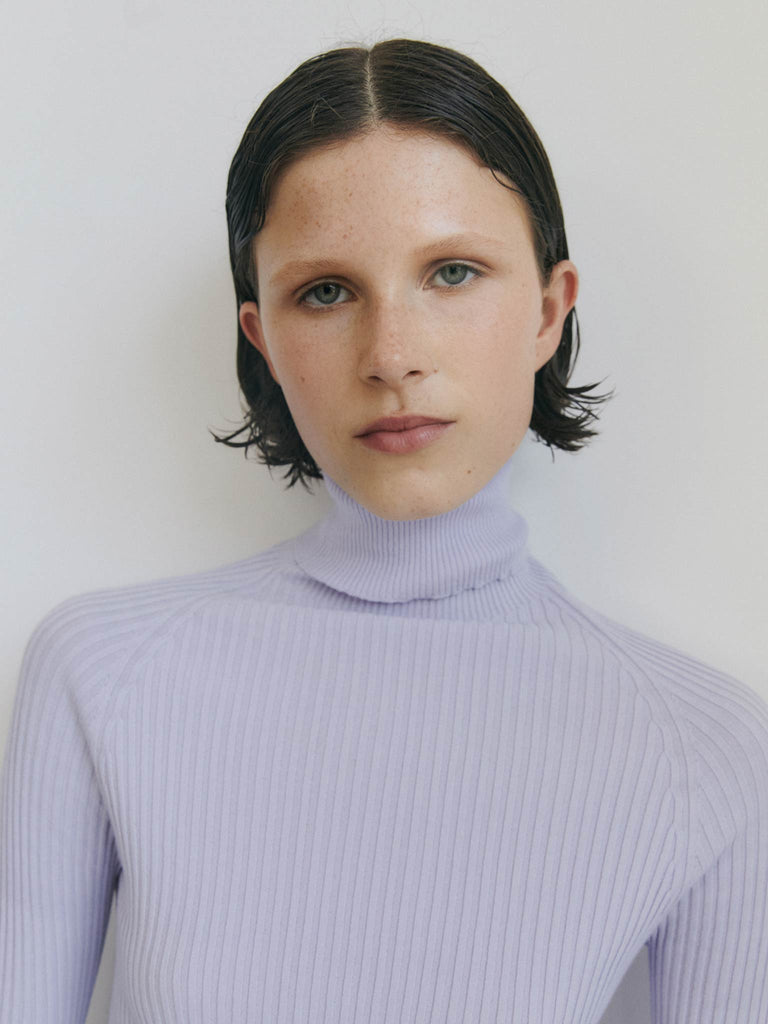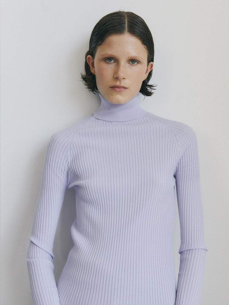 Fine ribbed turtleneck sweater knitted from fine viscose. Second skin seamless design for extra comfort, featuring raglan elongated sleeves with rolled trims. Versatile and perfect to be layered.