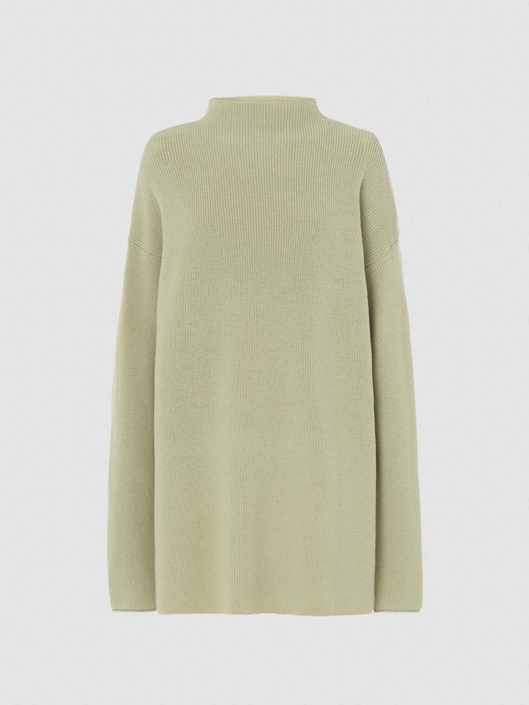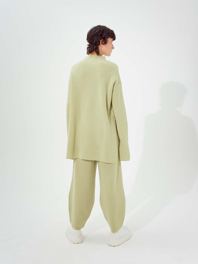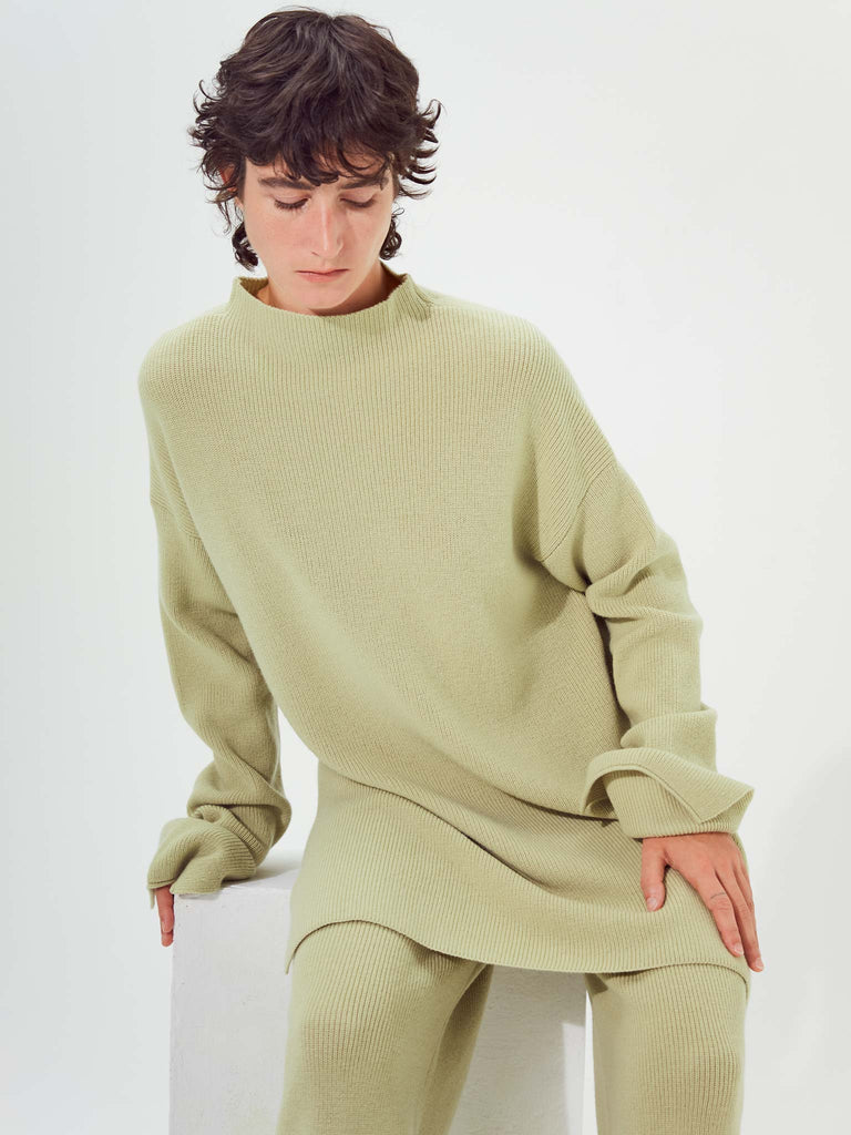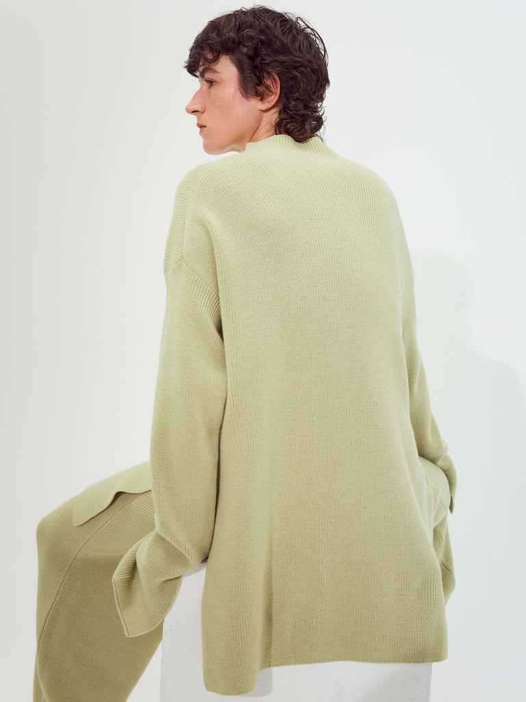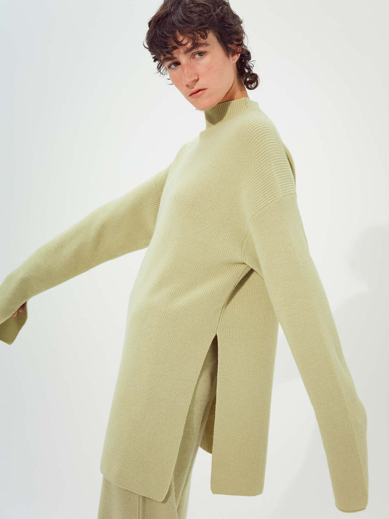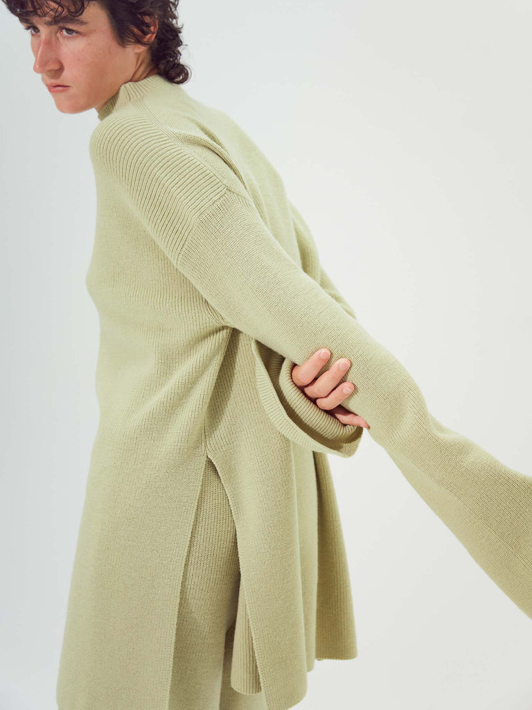 Relaxed elongated sweater knitted from extrafine soft wool. Features deep side splits and slightly elongated sleeves with slits at the cuffs. Integral mock neck and fully-fashioned details. For a complete set, wear with the Naifu pants.