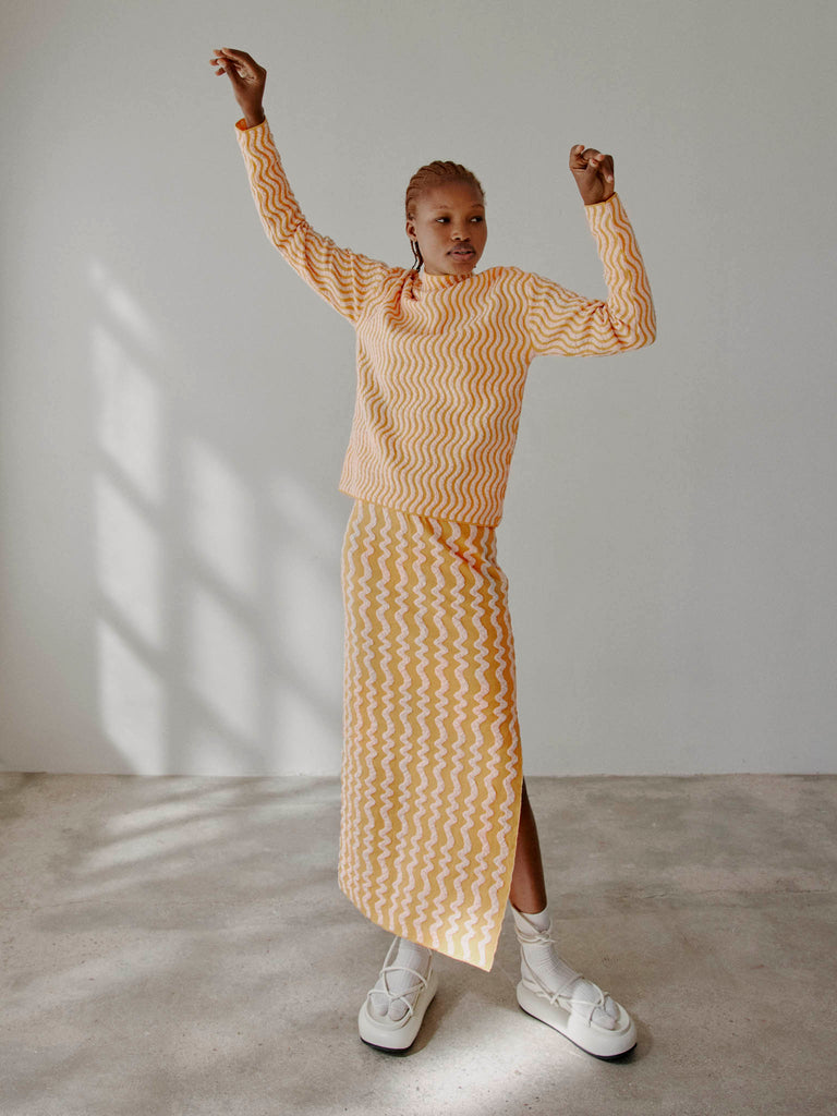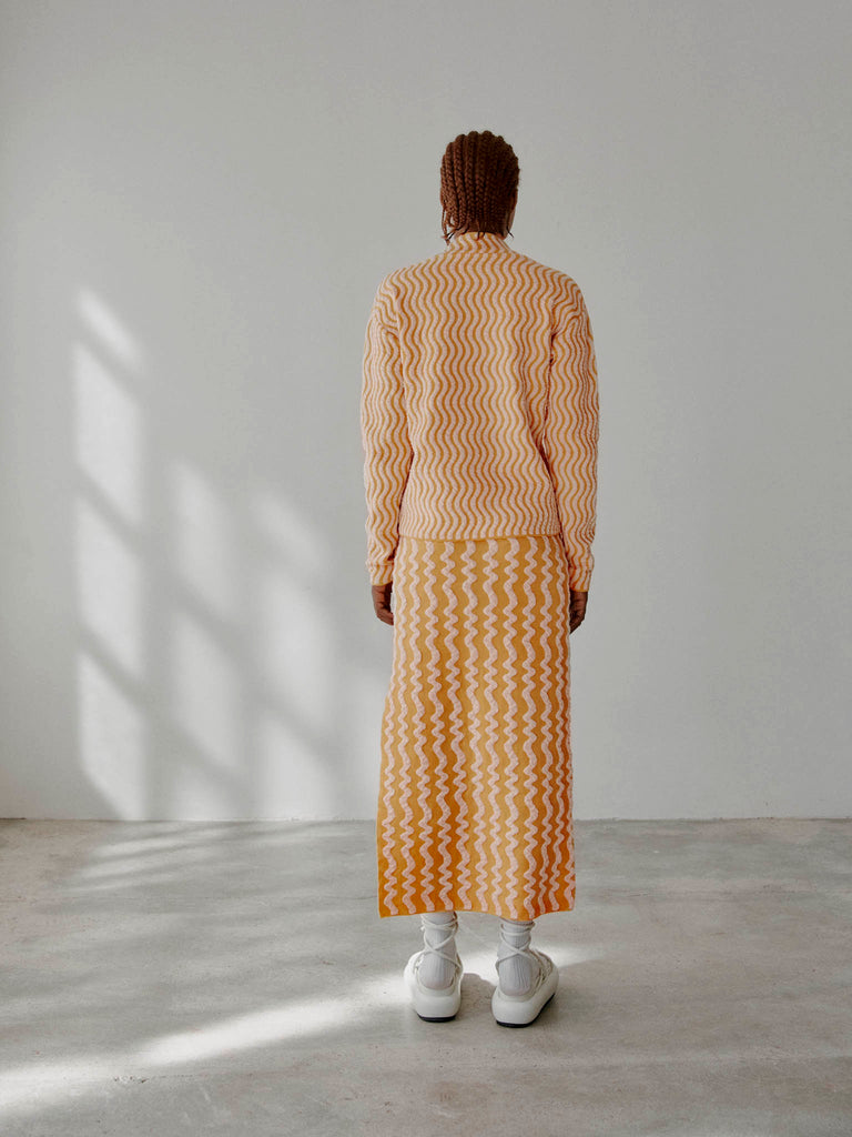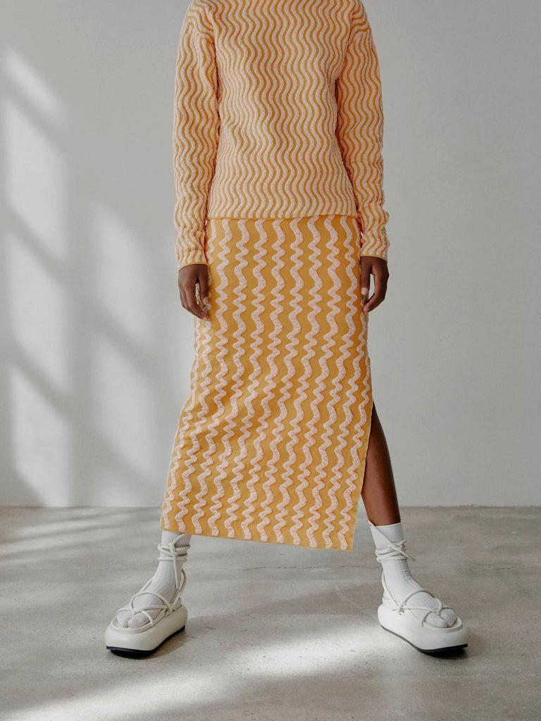 Midi skirt crafted in a wavy textured two-tone jacquard, knitted from fine merino wool and organic cotton with a touch of stretch. Straight fit featuring a deep asymmetrical side slit and an elasticated waistband.