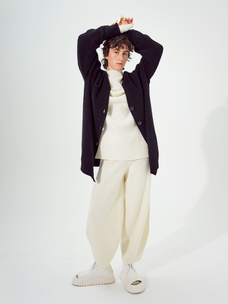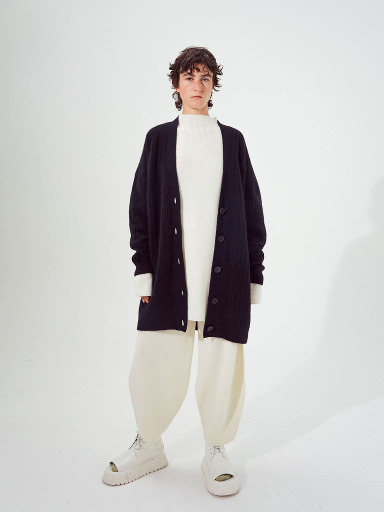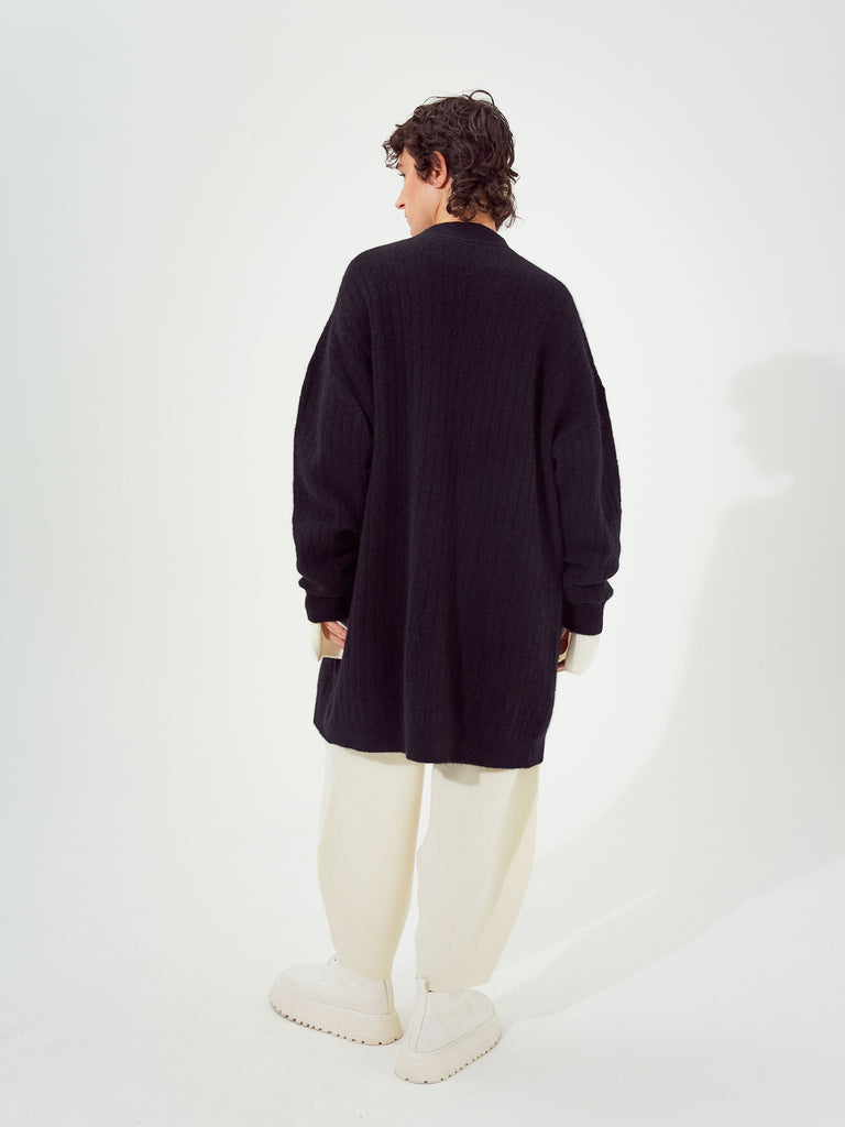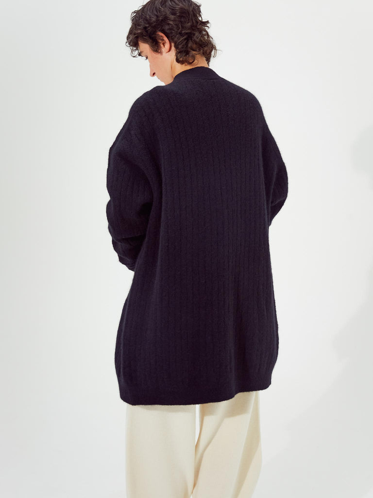 Ribbed oversized cardigan Regular priceRelaxed buttoned cardigan knitted from a fuzzy alpaca-wool blend yarn. Designed for a loose fit, features a deep v-neck, dropped shoulders and ample sleeves.