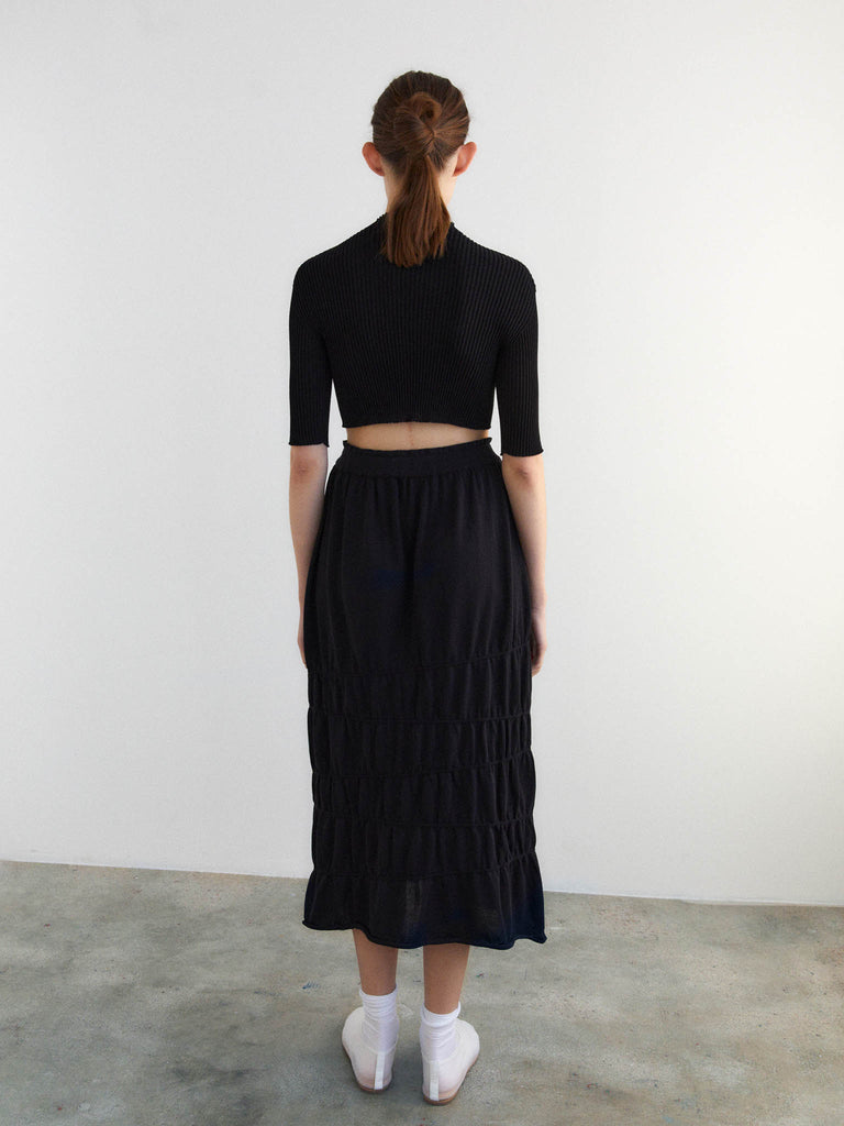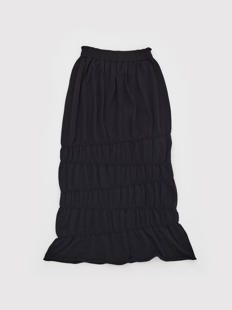 Midi skirt crafted from organic cotton. Relaxed fit featuring irregular positional ruching, an elasticated waistband and rolled trims.