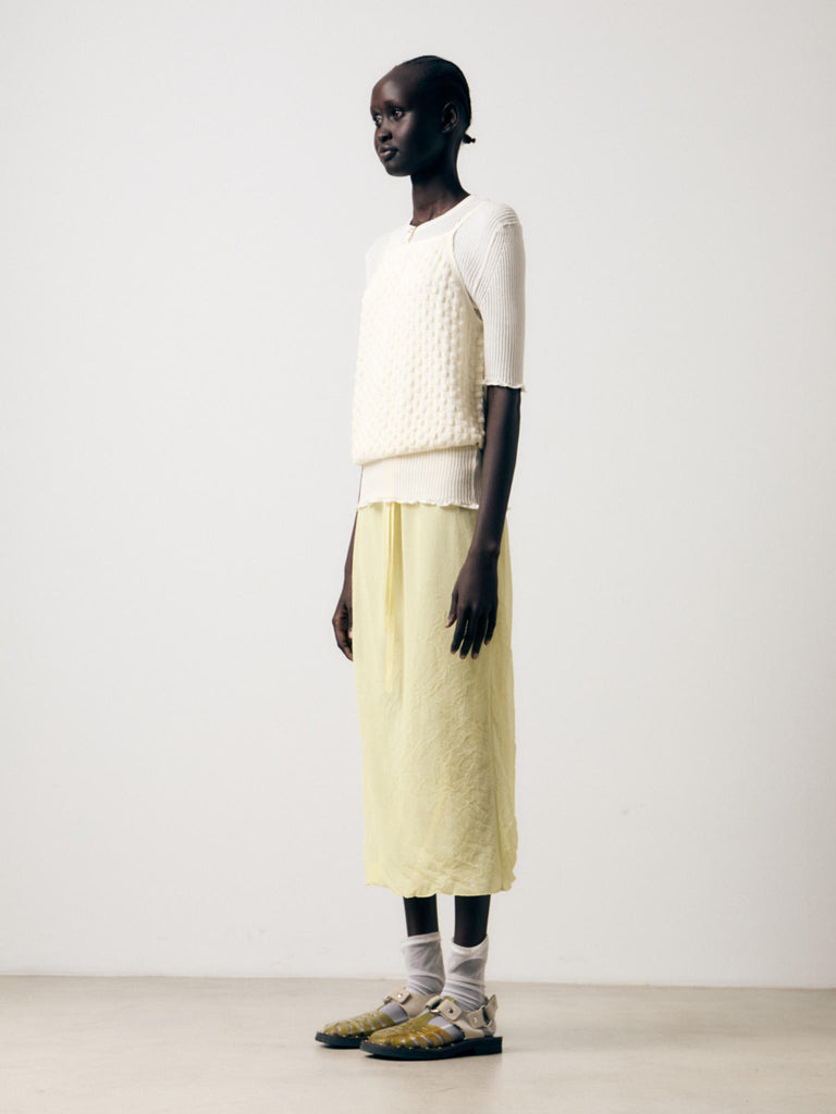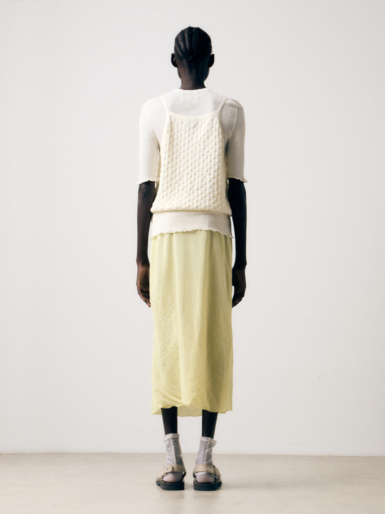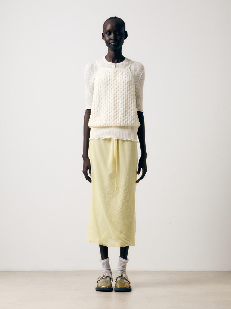 Lightweight knit knitted in a textured bubble-like stitch crafted from a ultrafine makò cotton blend with a dry handfeel. Relaxed fit with a ribbed hem that sits on the waist, featuring a square neckline and thin straps.