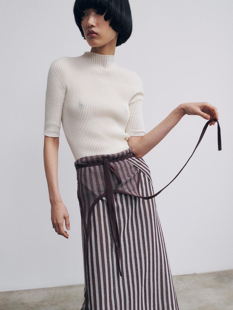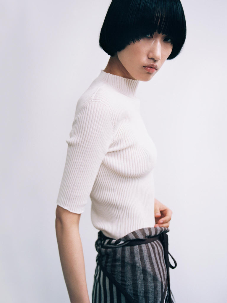 Ribbed second-skin top Regular priceRibbed knit crafted from an ultrafine makò cotton blend with a dry handfeel. Features an elongated silhouette, seamless mock neck, fitted body, and skinny elbow-length sleeves. Made using whole-garment technology for a seamless finish.