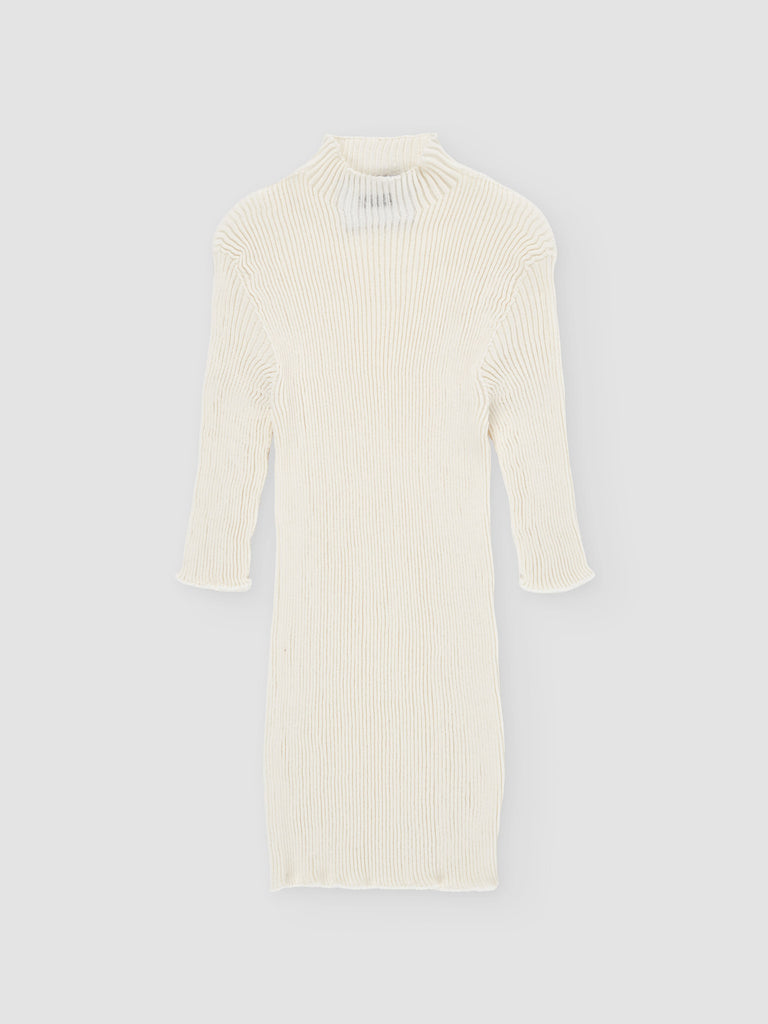 Ribbed knit crafted from an ultrafine makò cotton blend with a dry handfeel. Features an elongated silhouette, seamless mock neck, fitted body, and skinny elbow-length sleeves. Made using whole-garment technology for a seamless finish.
