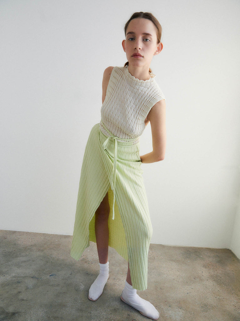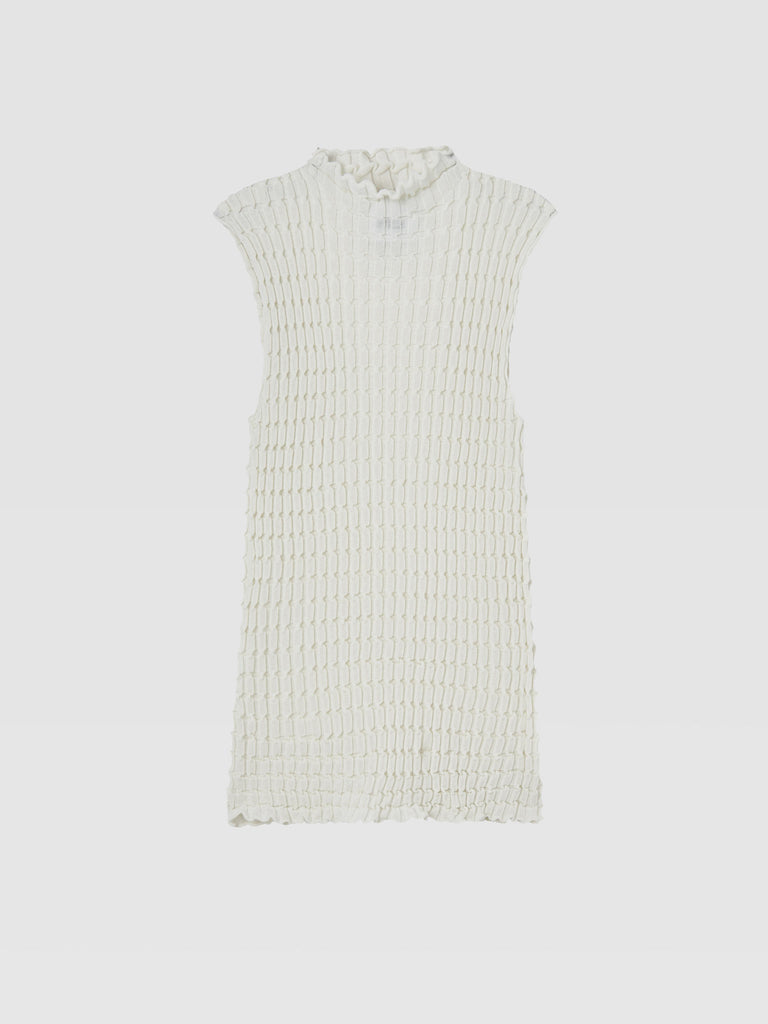 Textured sleeveless top Regular priceLightweight knit crafted from a ultrafine makò cotton blend with a dry handfeel, featuring a textured ribbed stitch that creates a pleated look all over. Elongated silhouette, seamless mock neck with a rolled trim.