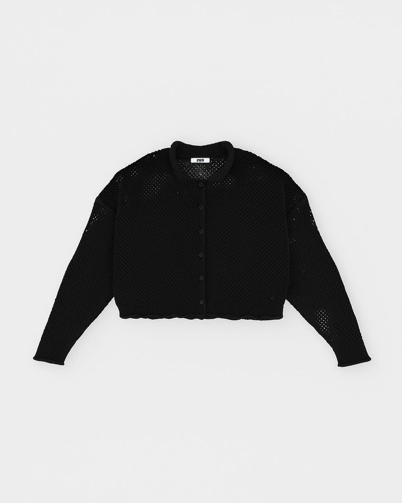 Crewneck cardigan crafted in a silk-cotton crochet-like stitch. Features a boxy, slightly cropped silhouette with a front placket, exposed seams, and ribbed edges finished with a rolled trim.