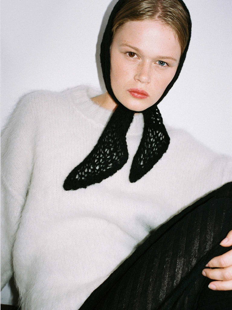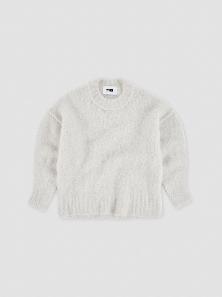 Brushed crewneck sweater Regular priceFuzzy brushed sweater crafted from a soft alpaca Suri blend. Relaxed boxy silhouette featuring rounded ample sleeves, exposed seams and ribbed neck, hem and cuffs.