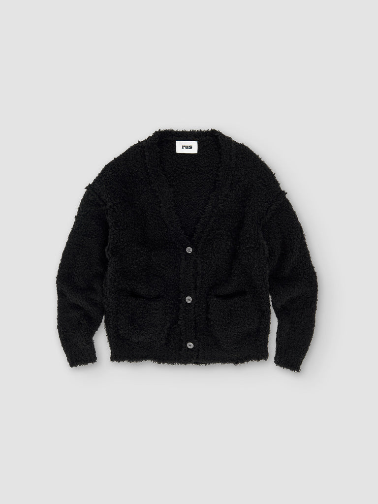 Relaxed buttoned cardigan knitted from a soft, textured wool blend. It features exposed seams, a deep V-neckline, slash front pockets, and ribbed cuffs and hem