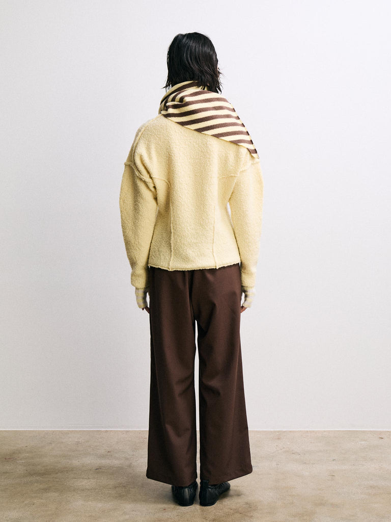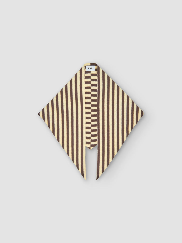 Striped triangular scarf in boiled merino wool, featuring a central exposed seam and raw-edge finishing throughout.