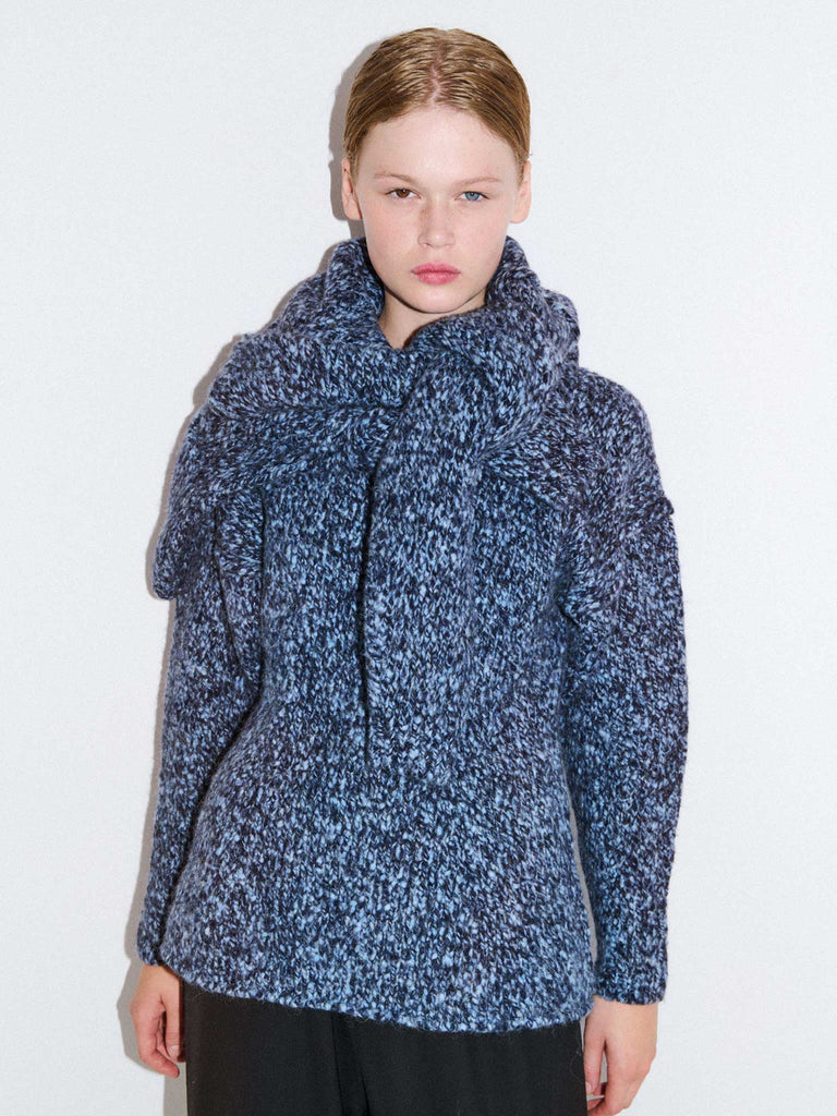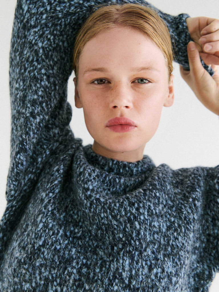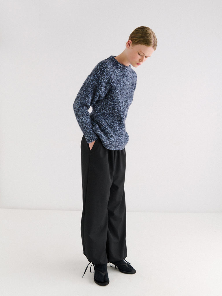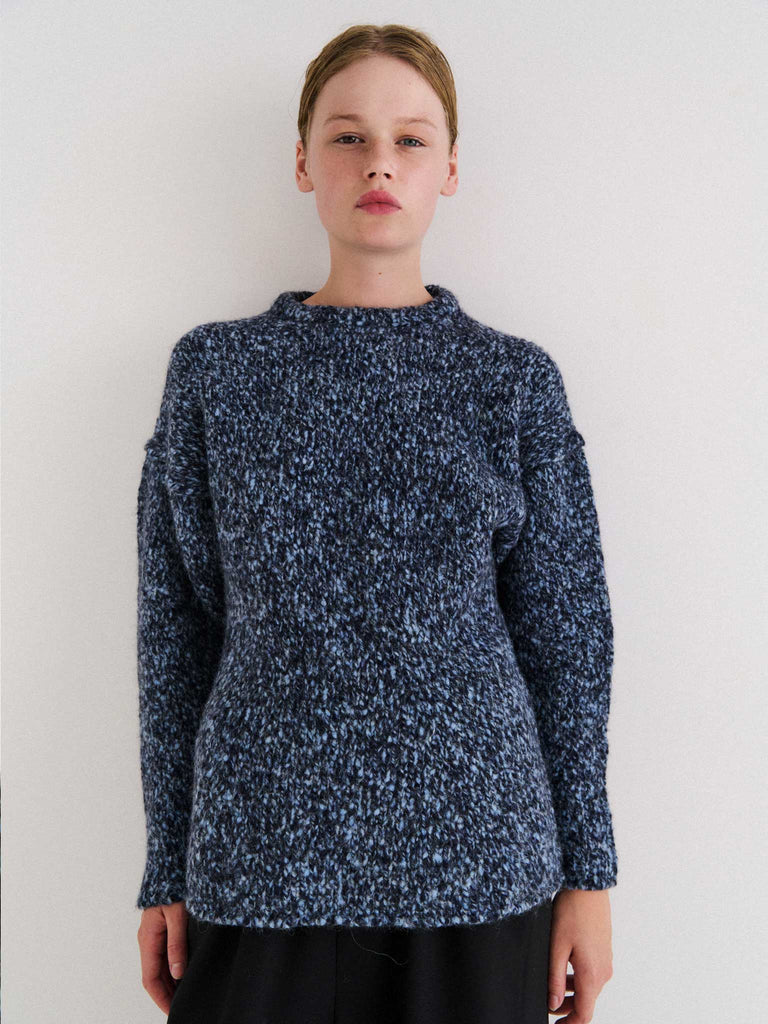 Crewneck sweater knitted from a soft, two-tone speckled merino wool and alpaca blend. It features exposed seams, dropped shoulders and is designed to be slightly fitted at the waist and loose at the hip.