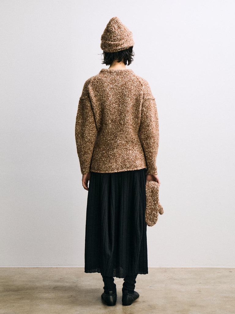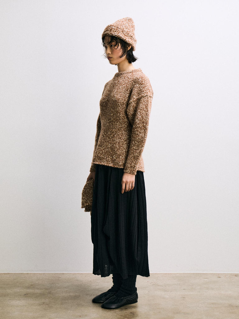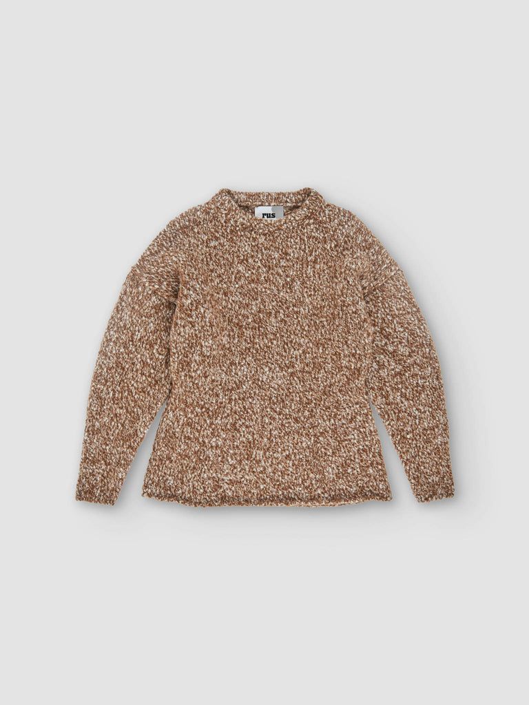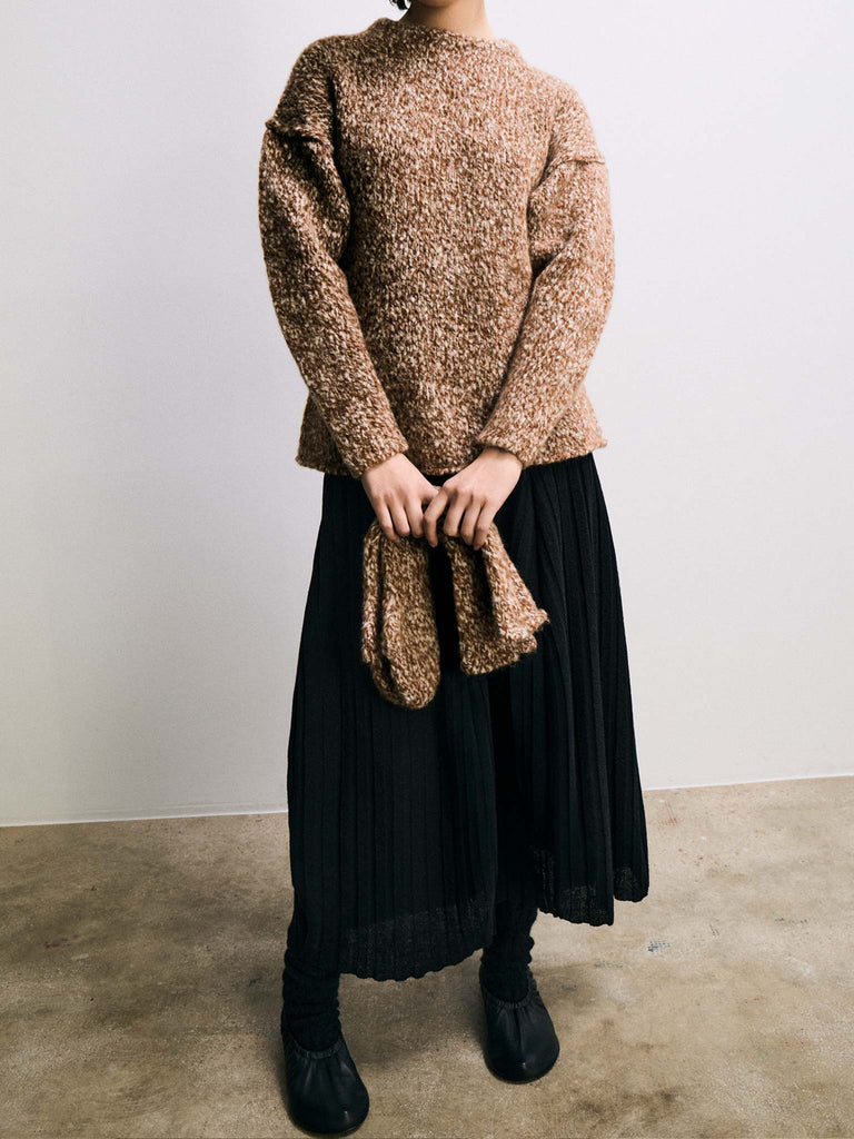 Crewneck sweater knitted from a soft, two-tone speckled merino wool and alpaca blend. It features exposed seams, dropped shoulders and is designed to be slightly fitted at the waist and loose at the hip.