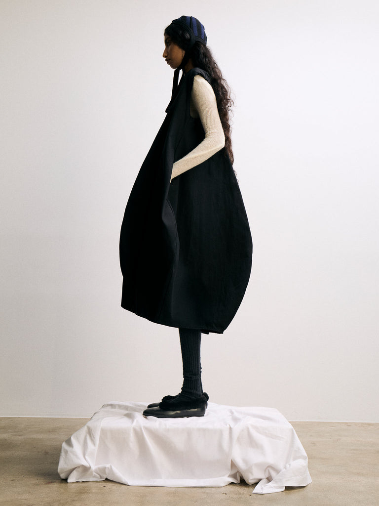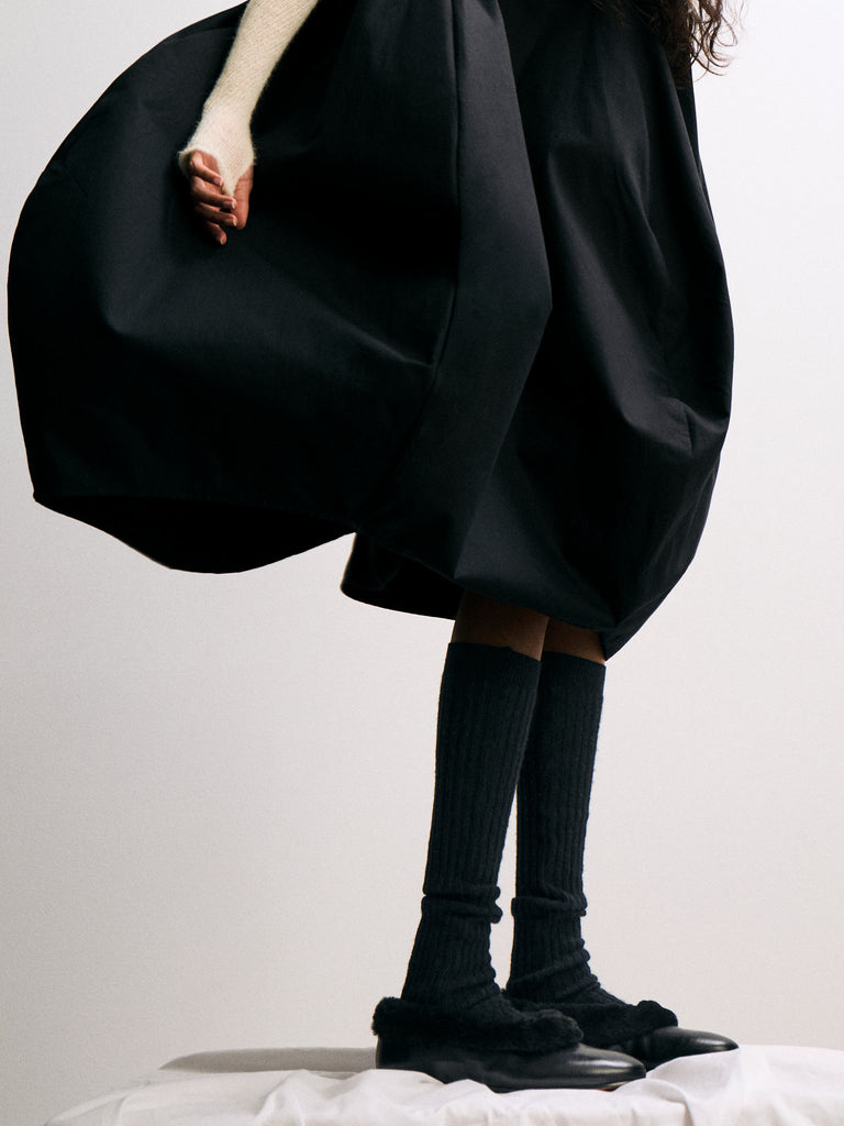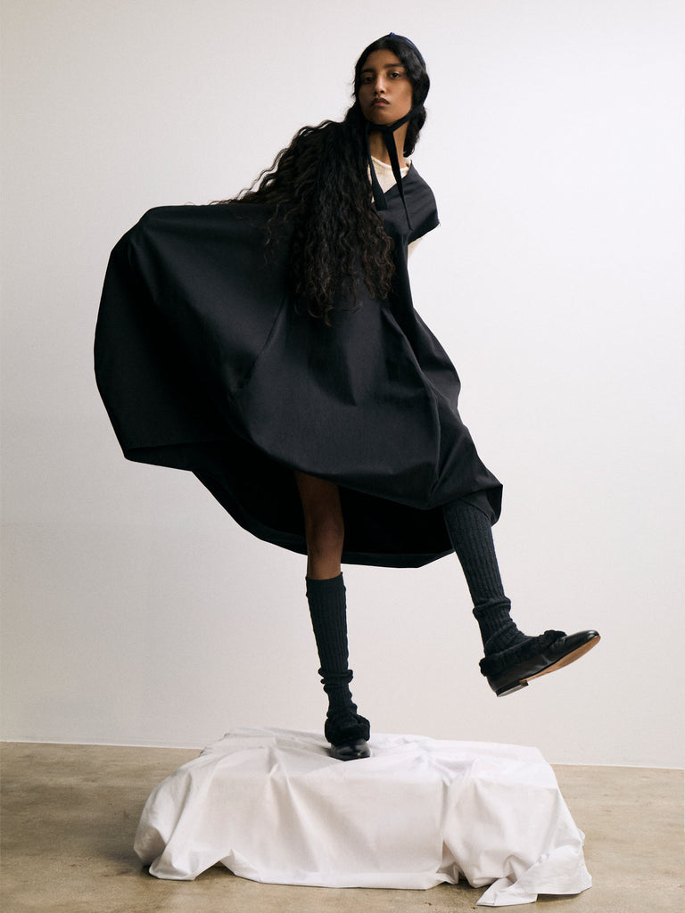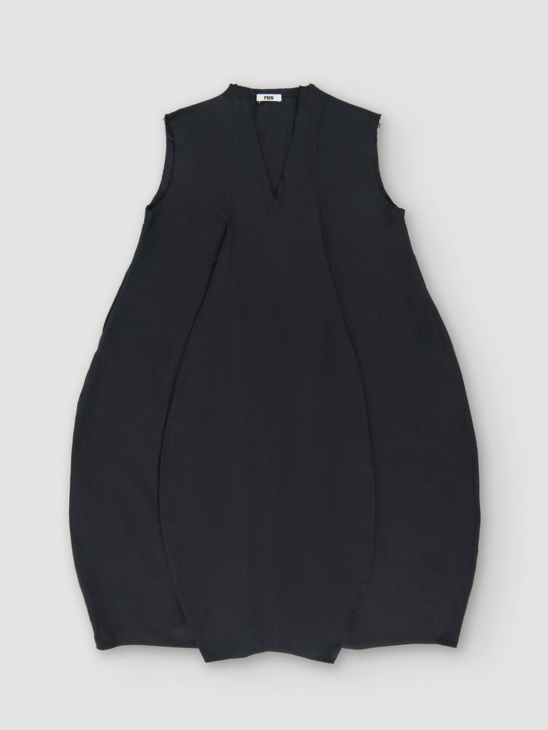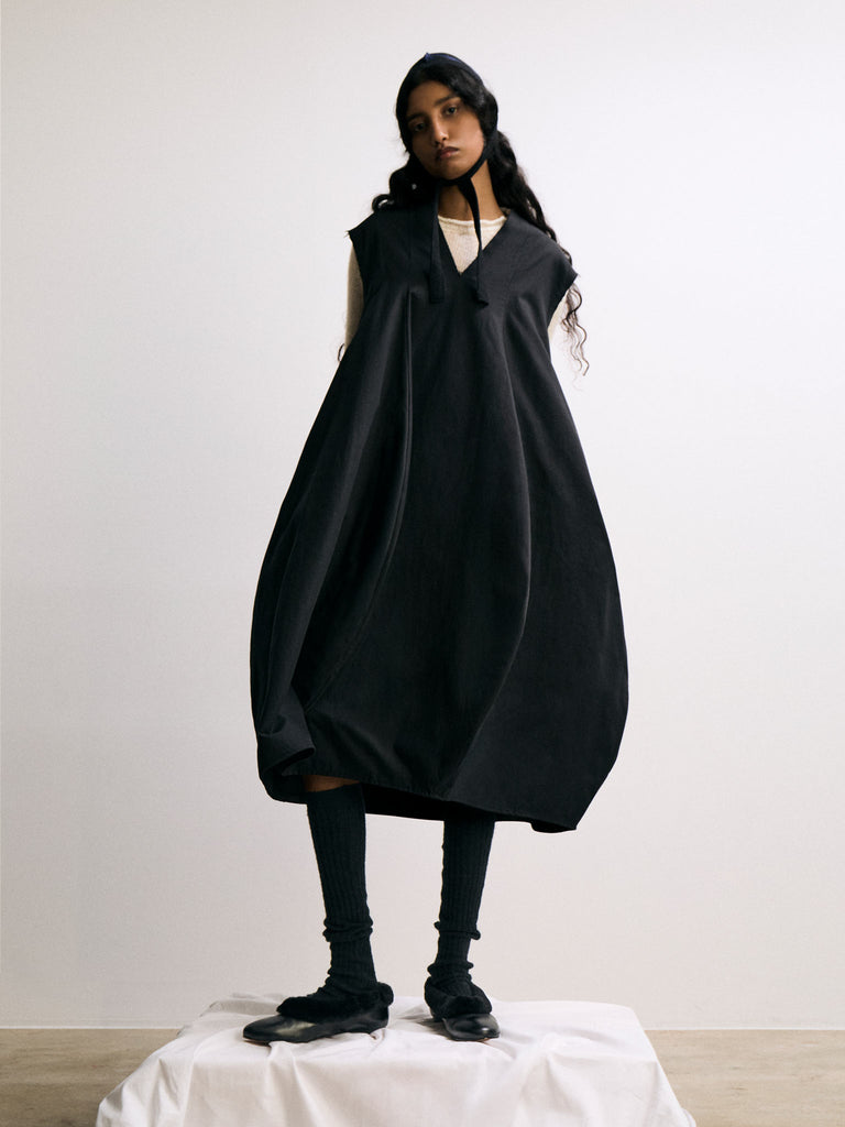 Balloon midi dress Regular priceMidi dress crafted from a cotton-linen fabric, with a loose-fitting silhouette and rounded, paneled structure. Features a V-neck and side pockets; perfect layered or worn alone.