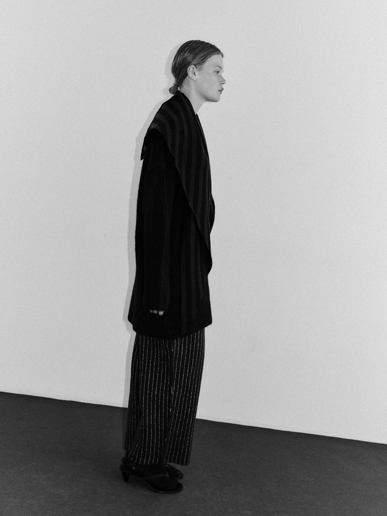 Fuzzy oversized sweater Regular priceFuzzy brushed sweater knitted from a luxurious alpaca Suri blend. Relaxed elongated silhouette with a wide neck trim and structured sleeves with exposed seams.