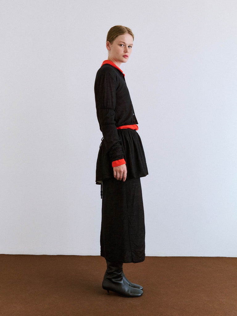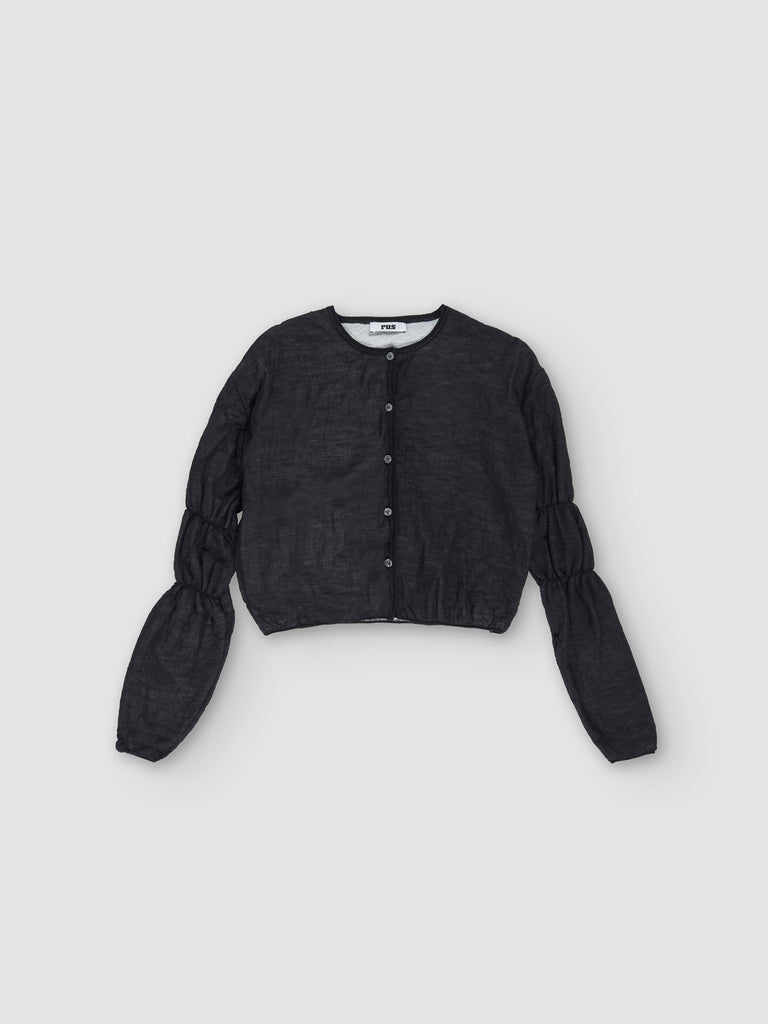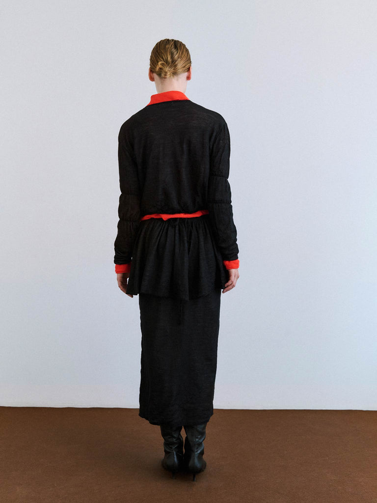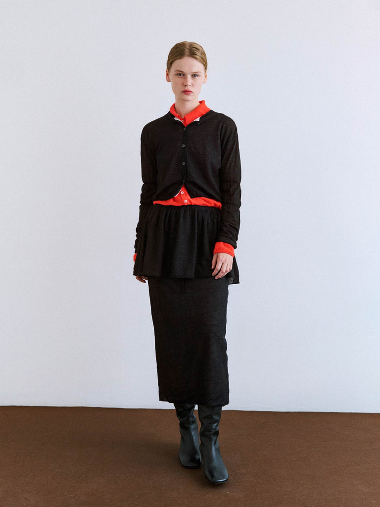 Ruched wool cardigan Regular priceKnitted cardigan in double-layer fine merino wool, featuring a contrasting chalk inner layer that adds subtle volume. Designed with a slightly cropped silhouette, buttoned front, long sleeves with positional ruching, and rolled-edge trims.